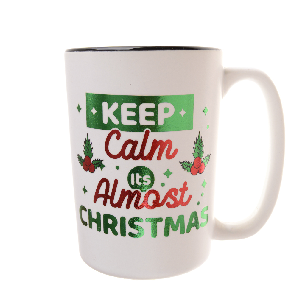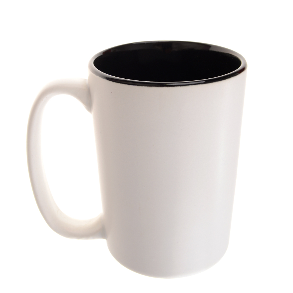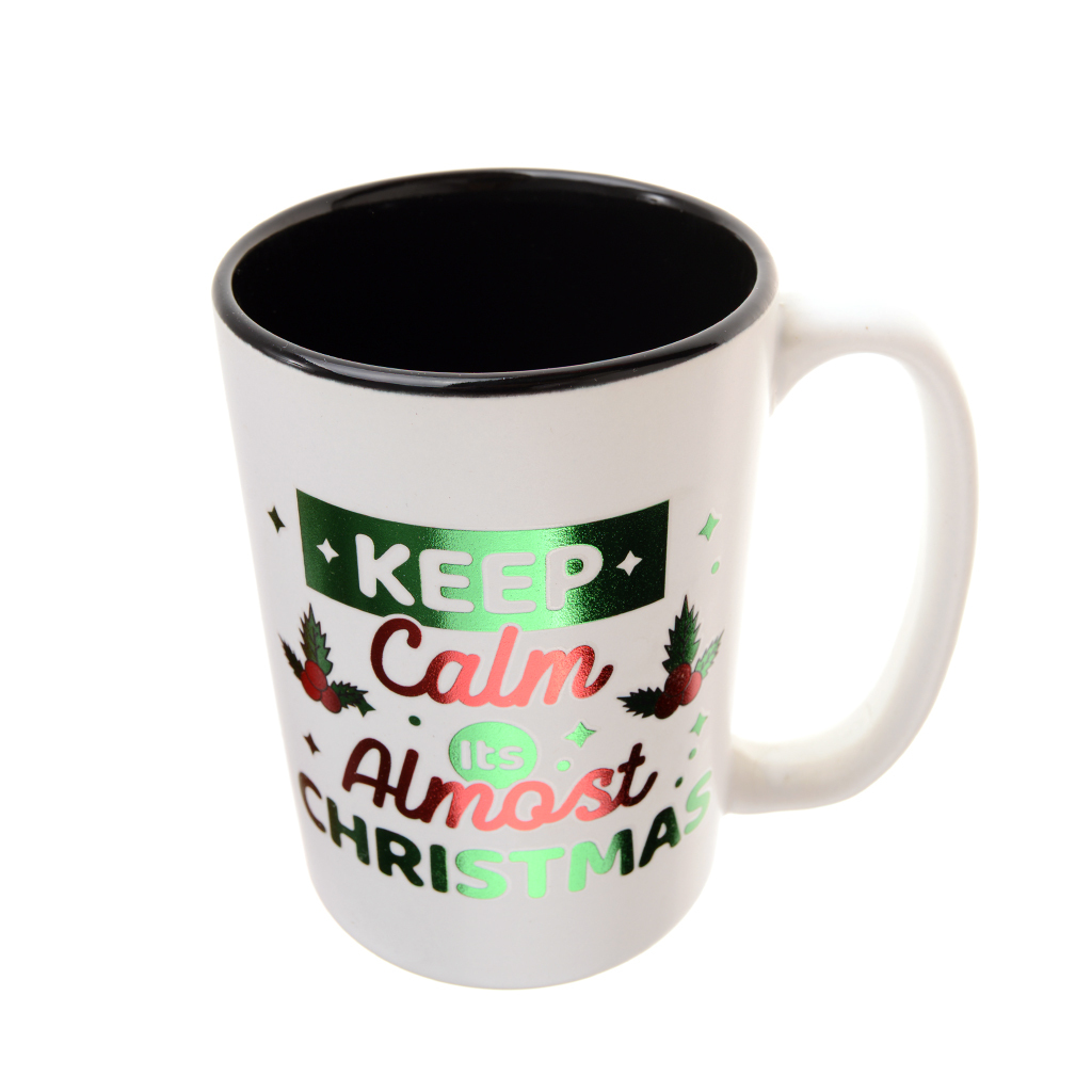 Керамична чаша с тематичен принт и черен цвят отвътре. Декорирана е с различни надписи и декорации.