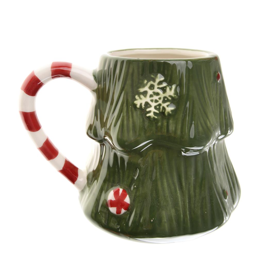 Керамична коледна чаша с формата на 3D елха и червено - бяла дръжка, тип бастунче.