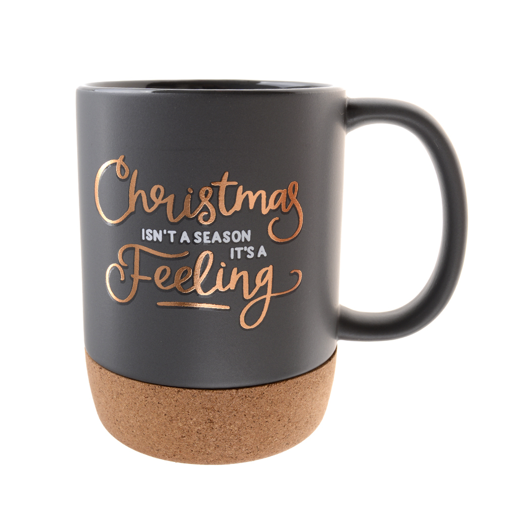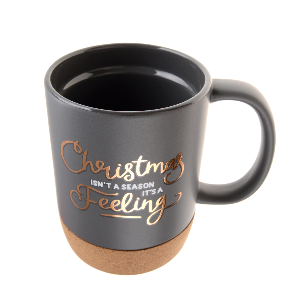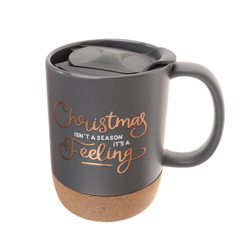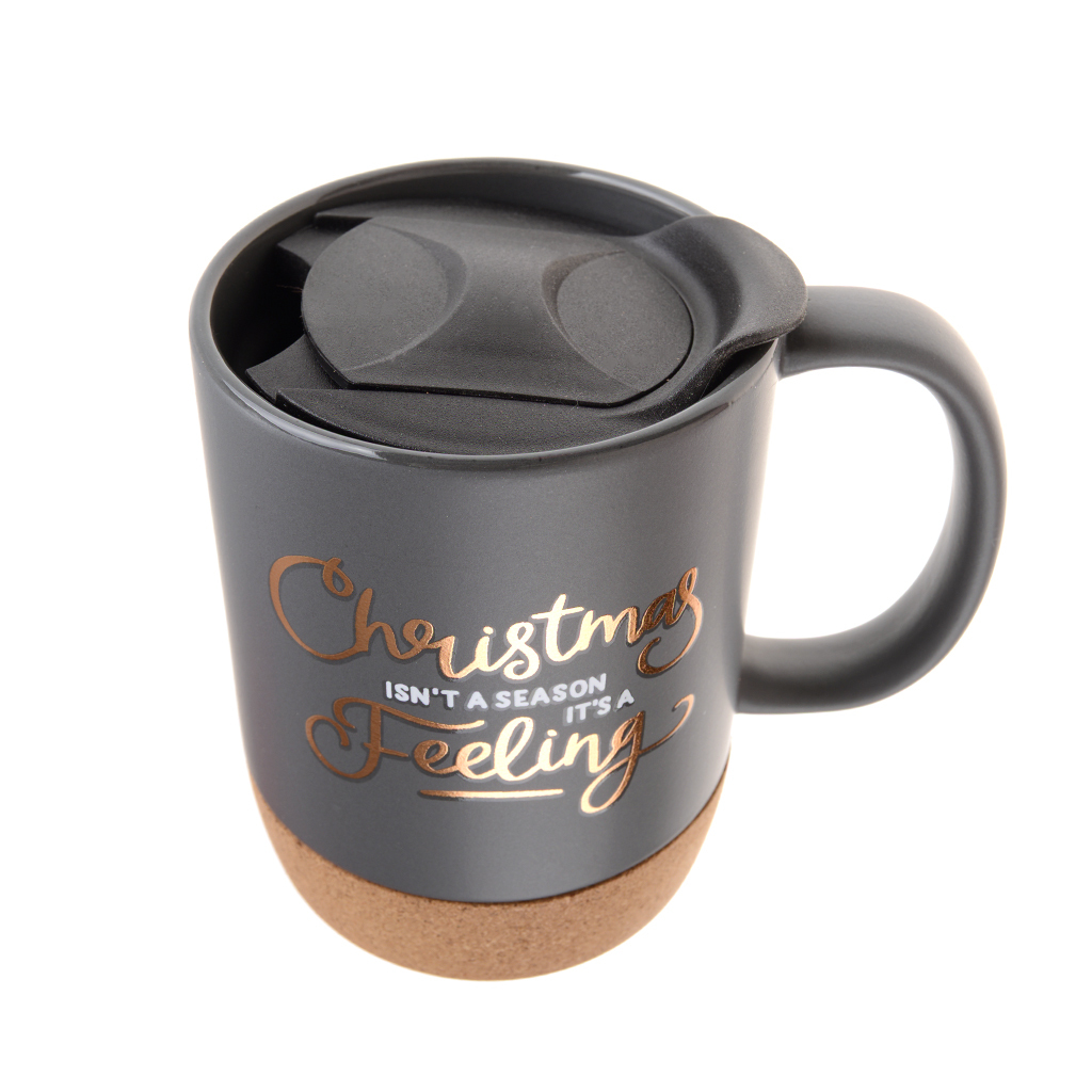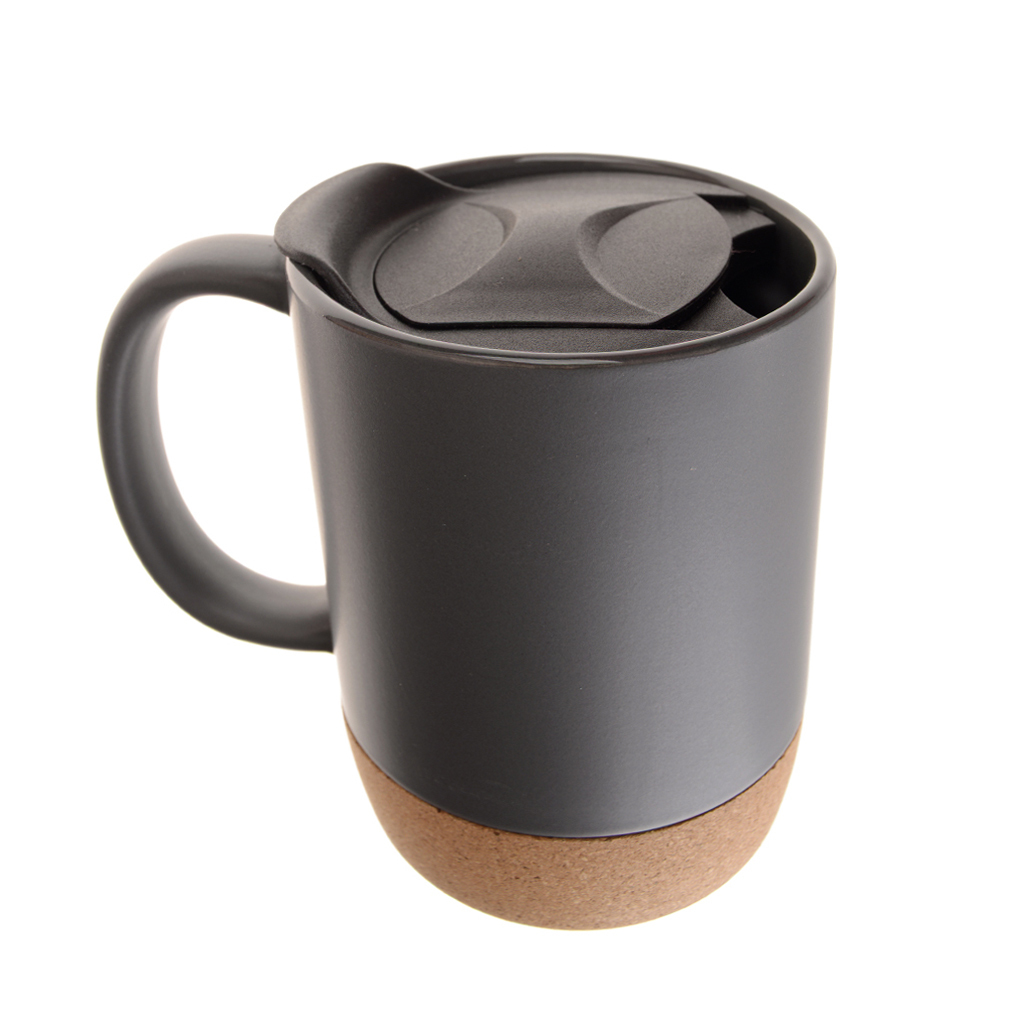 Керамична термо чаша с PVC капаче и корково дъно. Декорирана е в черен цвят с принт на лъскав надпис.