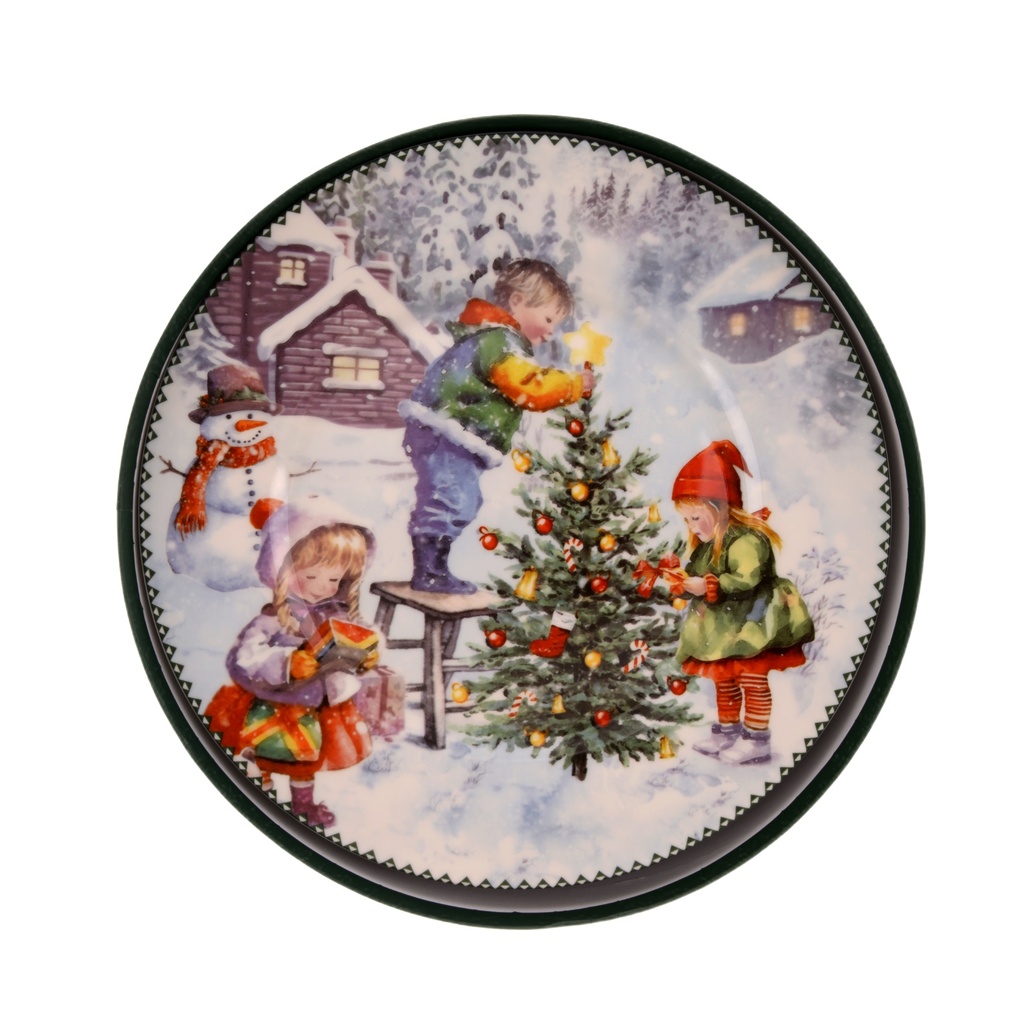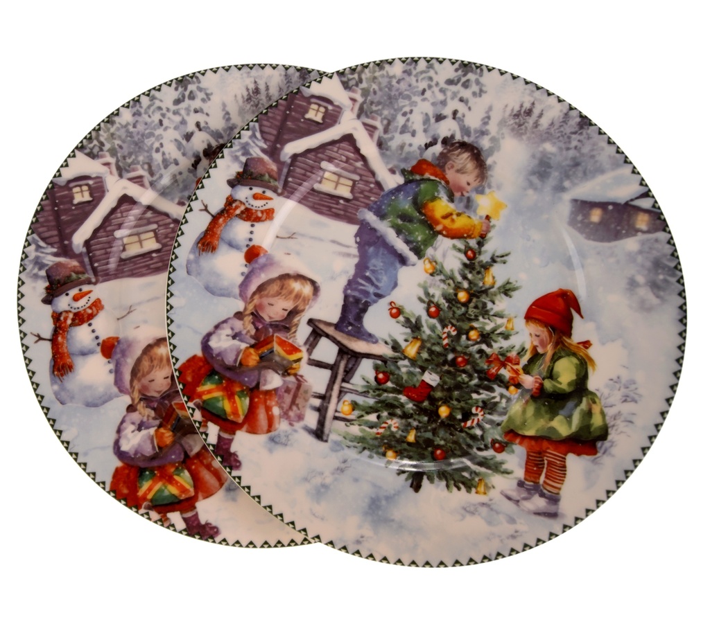 Декорирани са с принт на деца, украсяващи елха на фона на заснежено селце.