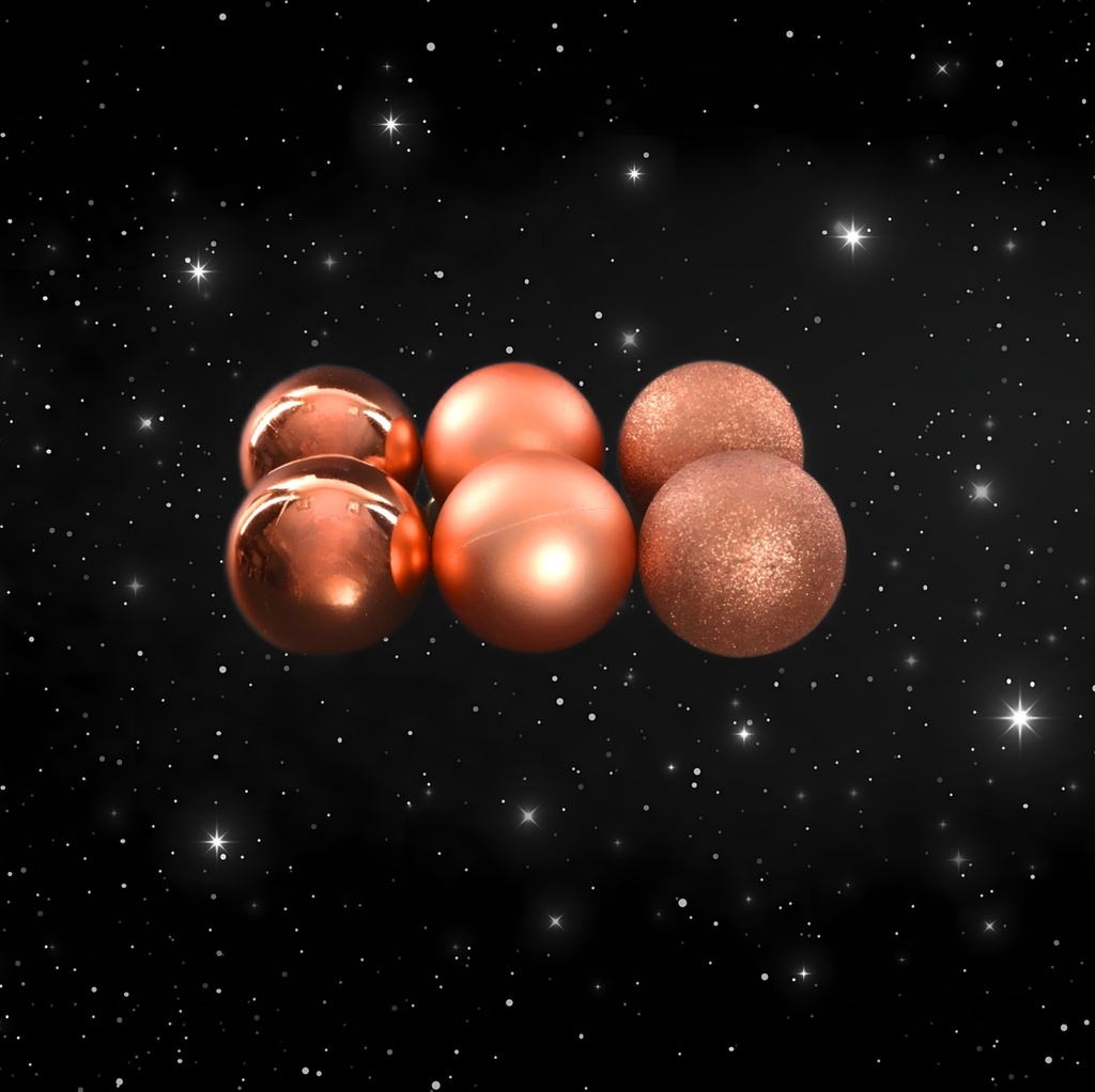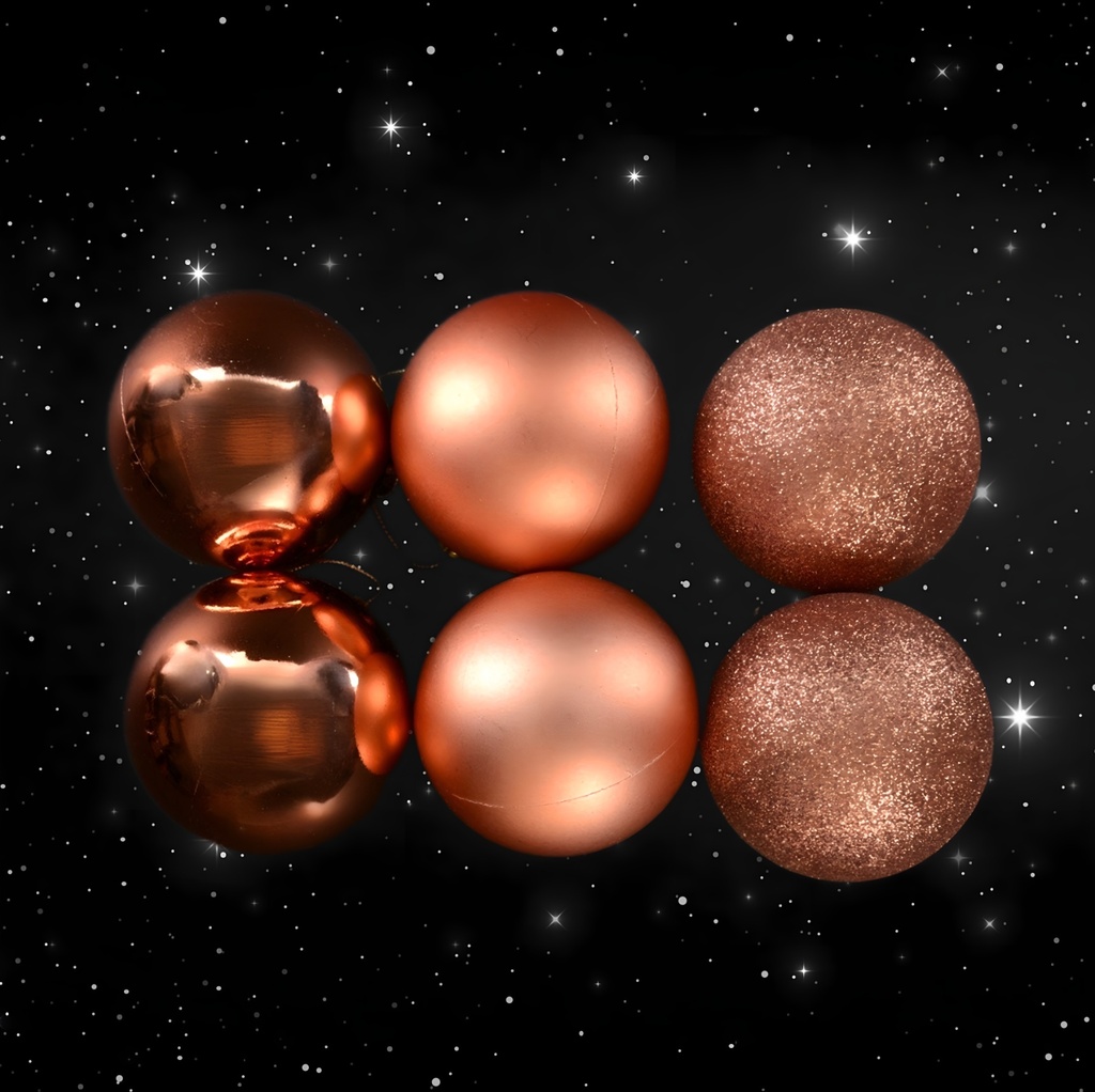 Комплект от 6 броя коледни играчки. Декорирани са в цвят розово злато с различни ефекти.