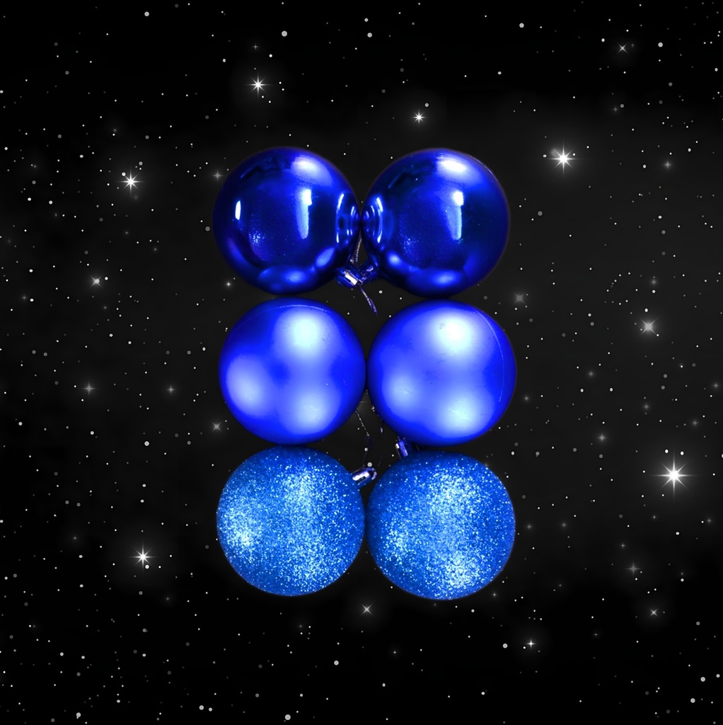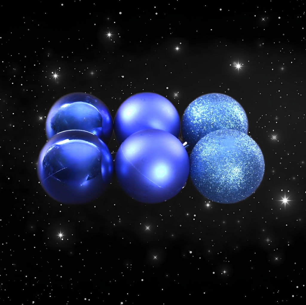 Комплект от 6 броя коледни играчки. Декорирани са в син цвят с различни ефекти.