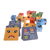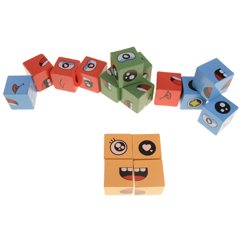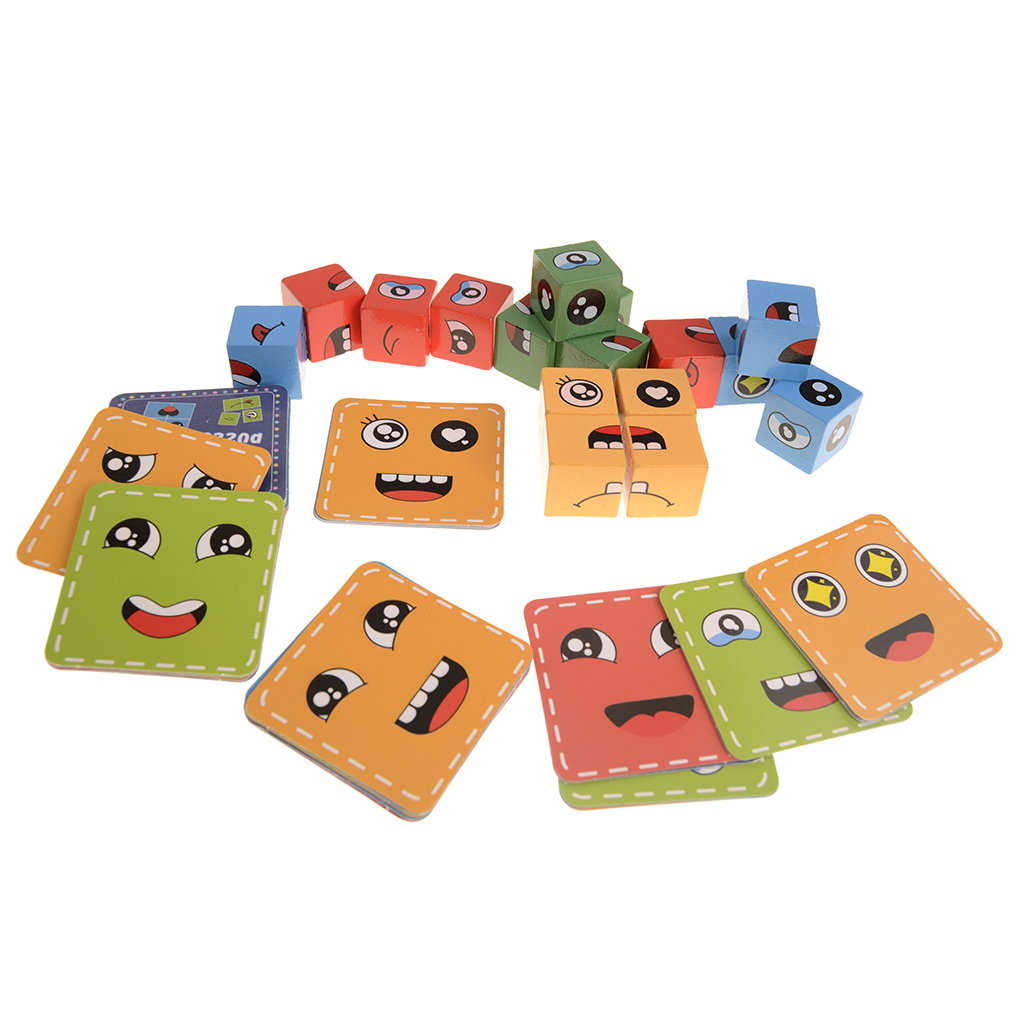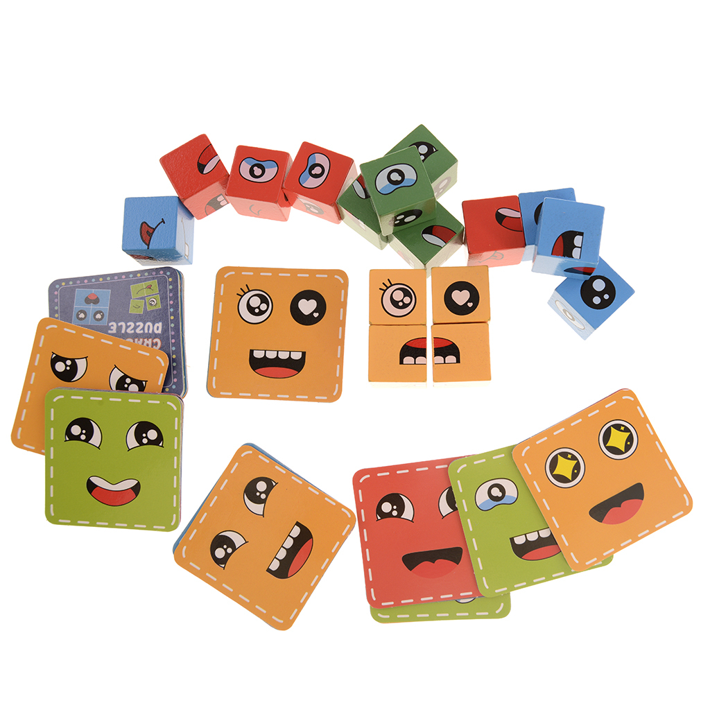 Комплектът включва 16 броя цветни дървени кубчета и карти с примерни лица, които детето трябва да подреди.