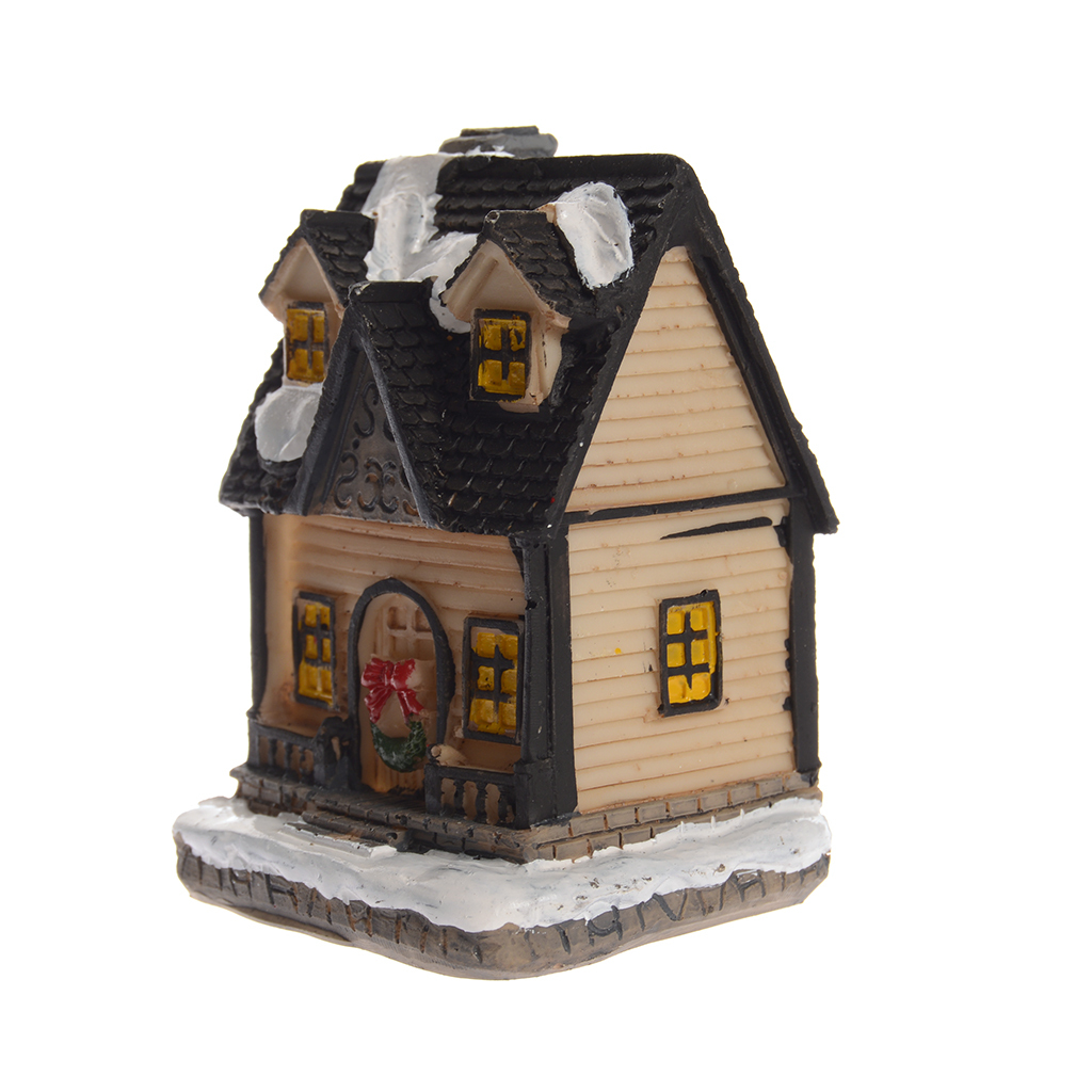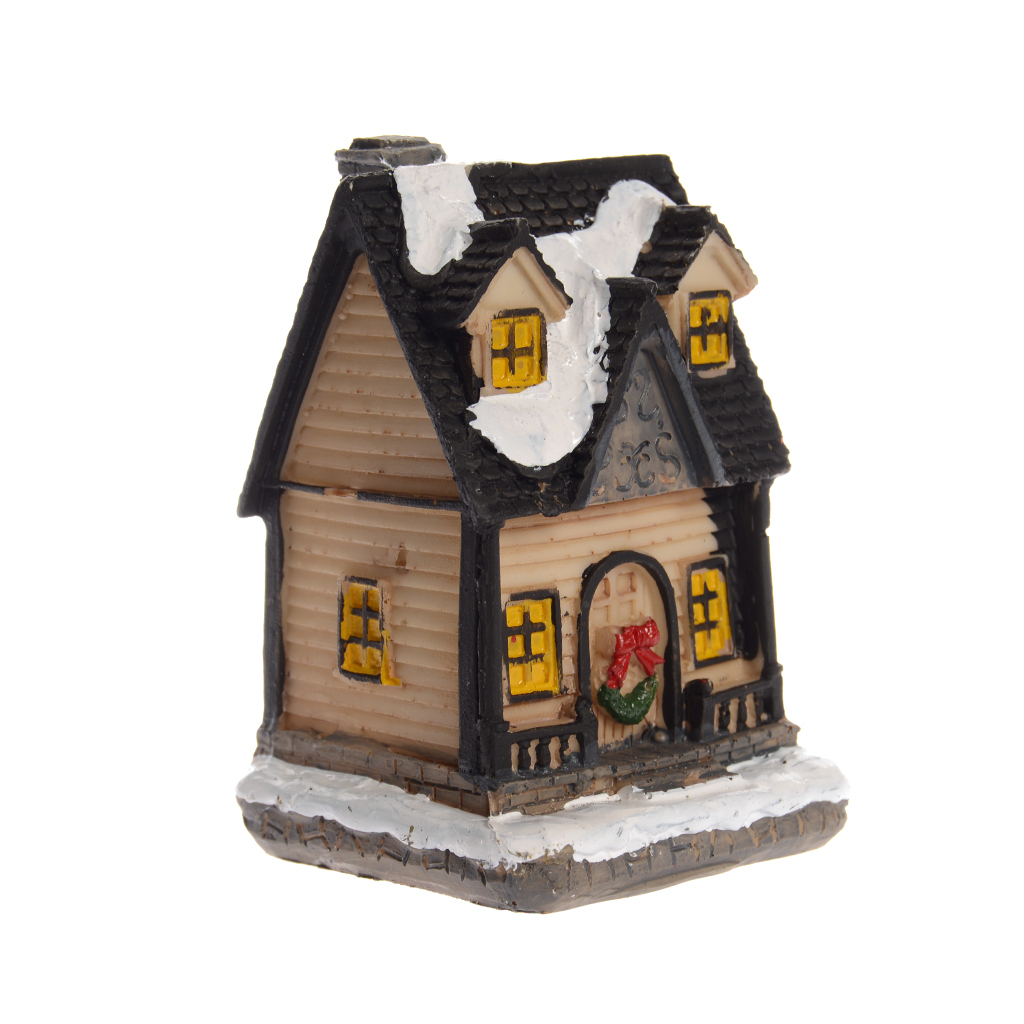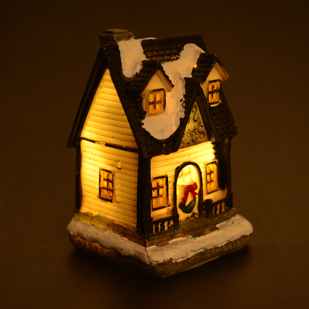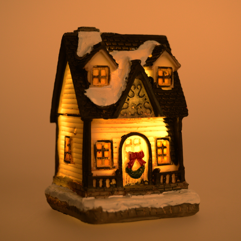 Сувенирна декоративна коледна фигурка - светеща къщичка. Украсена е с празнични декори и сняг.