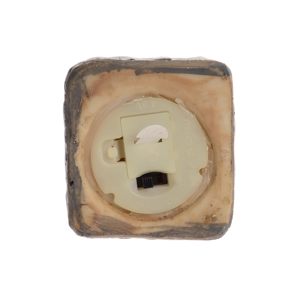 Отдолу има бутон On/Off и предпазител да не свети. Работи с малки кръгли батерии 4.5 V.