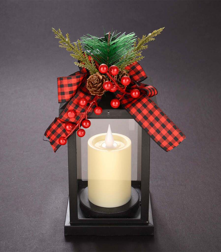 Декоративна фигурка - светещ фенер с изкуствена свещ. Декориран е с карирана панделка, шишарки, клонки и елхичка.