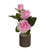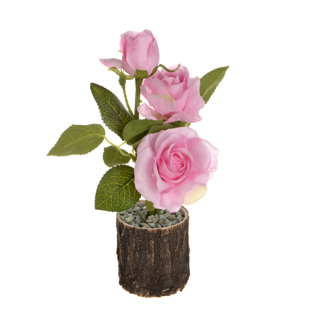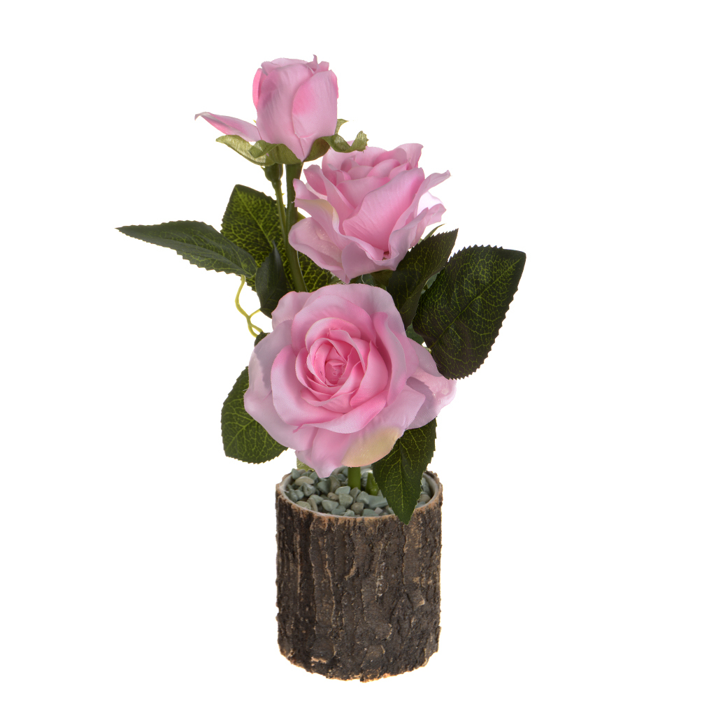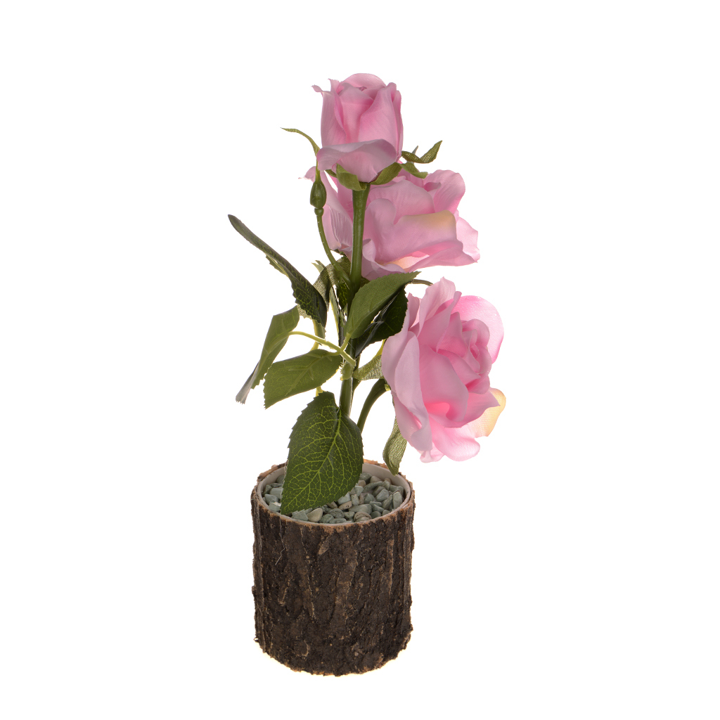Цветето е поставено в стилна саксия, оформена като изрязано дърво и запълнена с декоративни камъчета.