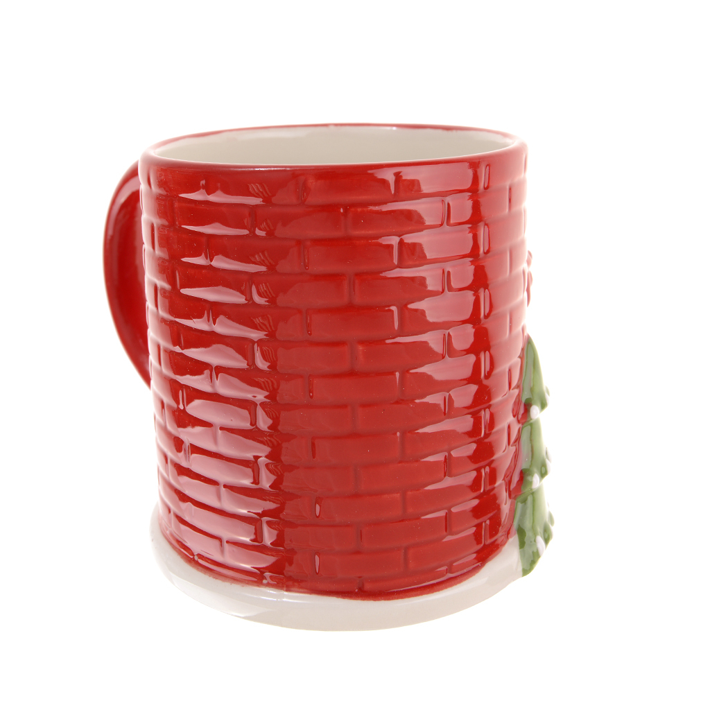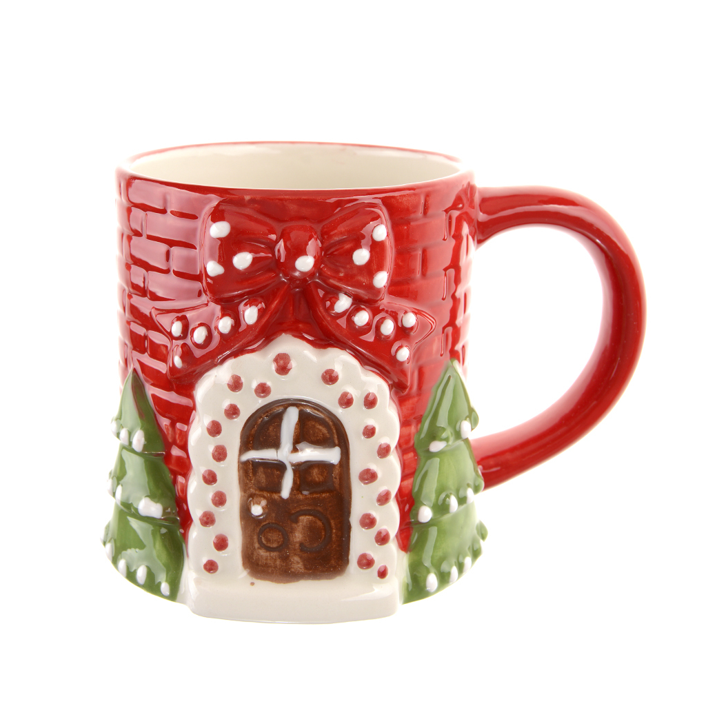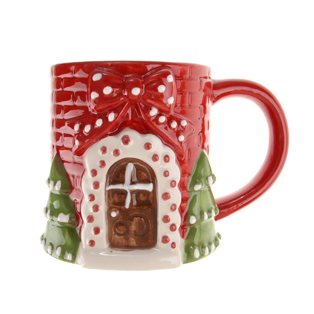 Керамична коледна чаша в картонена кутийка. Декорирана е с 3D релефни и ефектни тухлена къщичка, панделка и елхи.