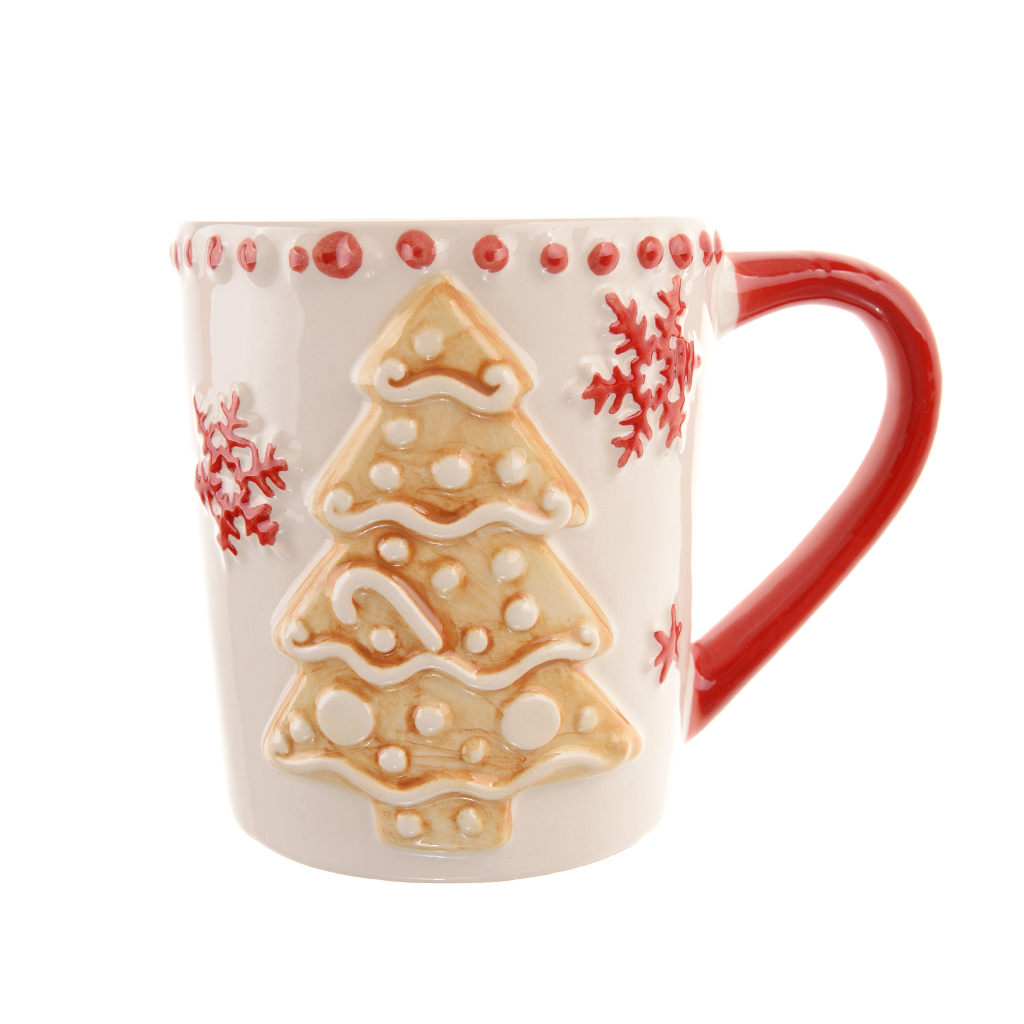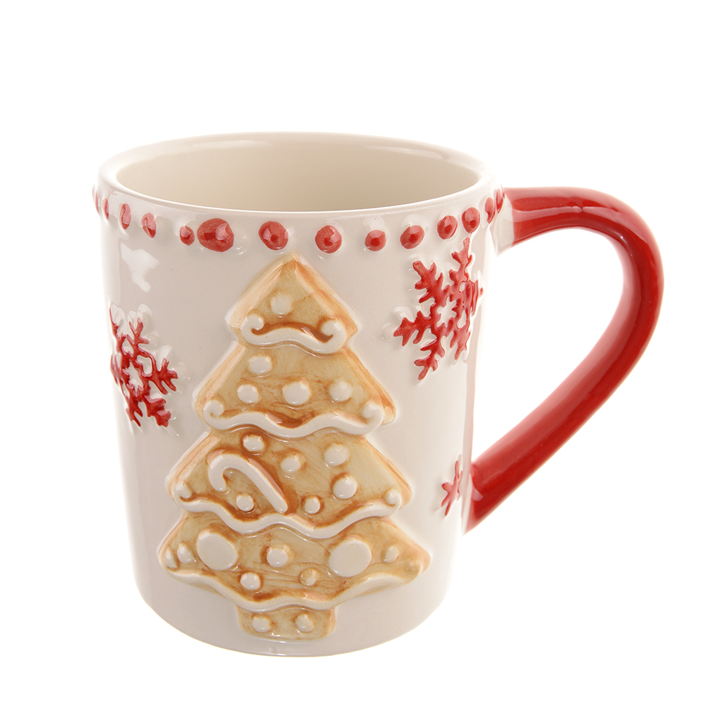 Керамична коледна чаша в картонена кутийка. Декорирана е с 3D релефни и ефектни елха, снежинки и точки.