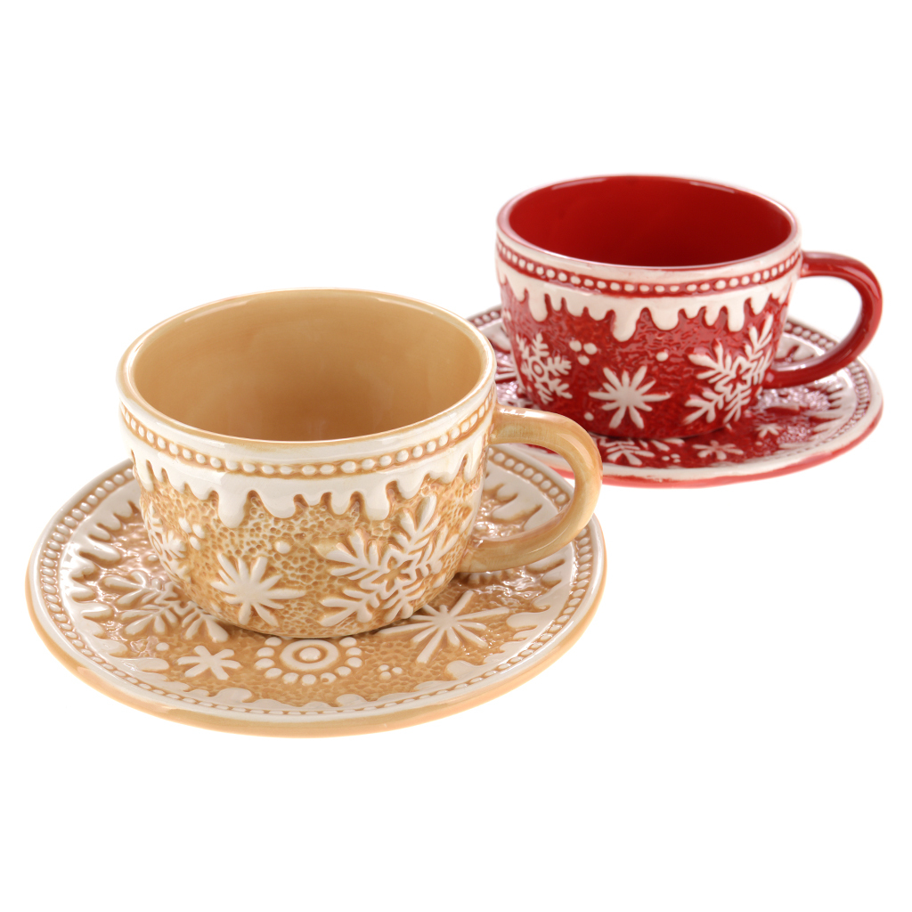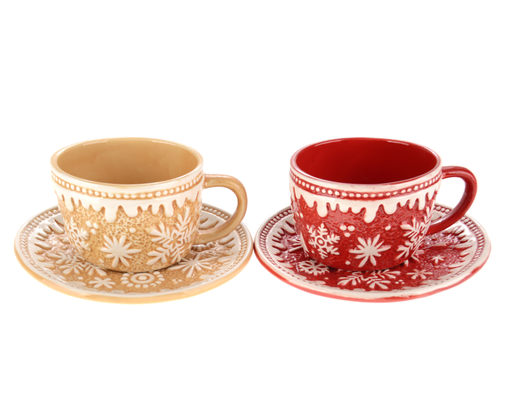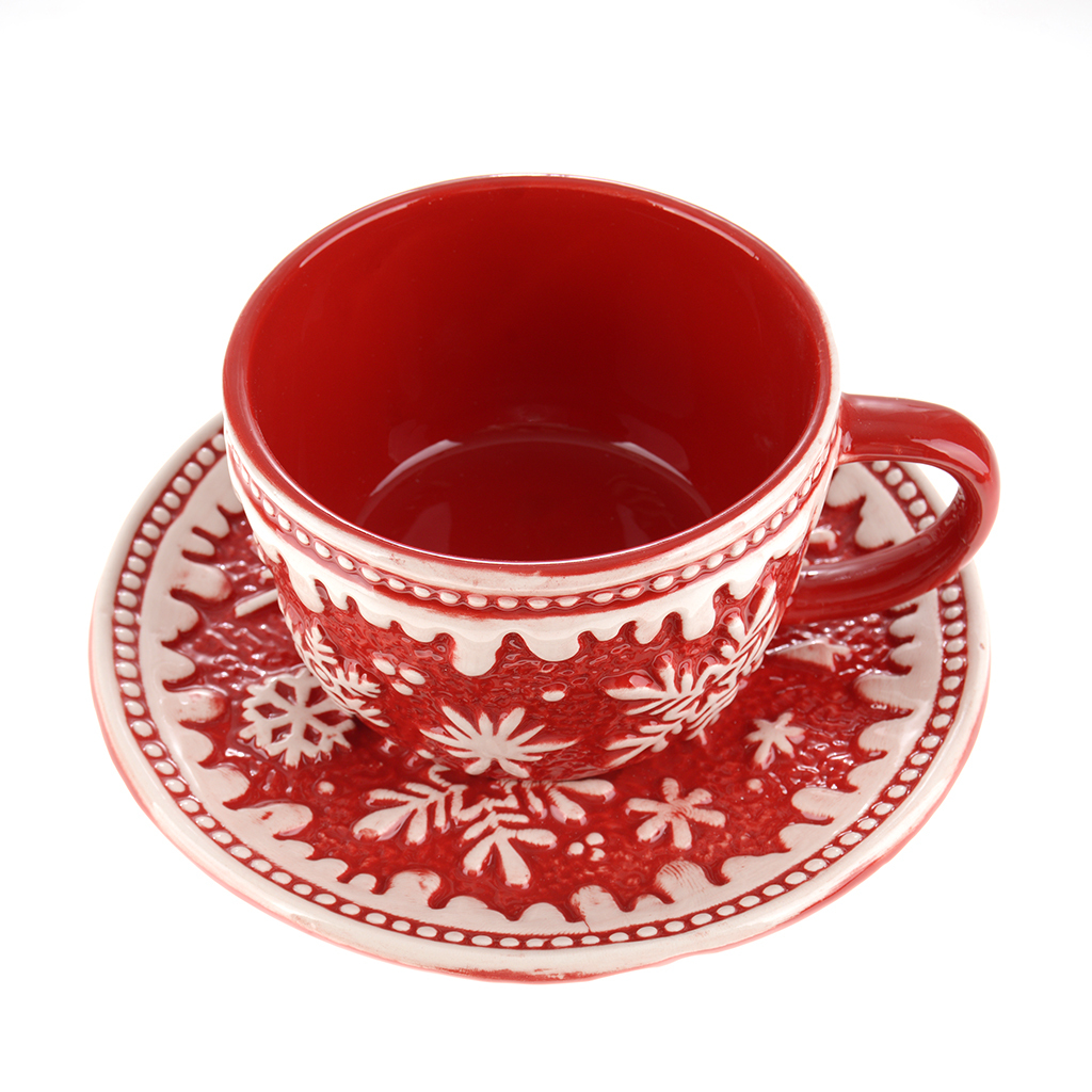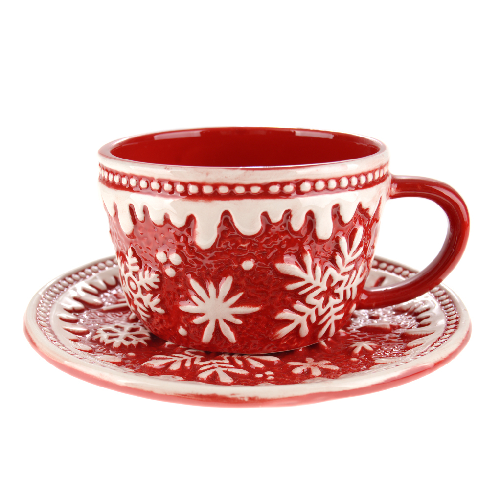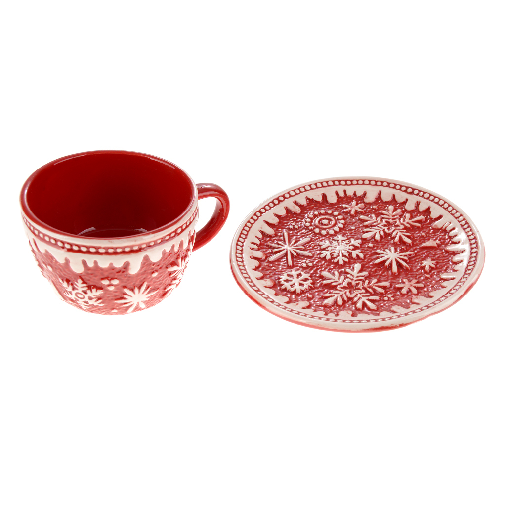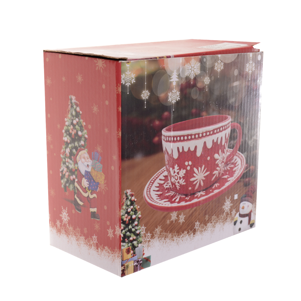 Керамична коледна чаша в картонена кутийка. Декорирана е с различни видове 3D релефни снежинки.
