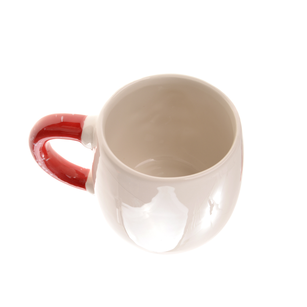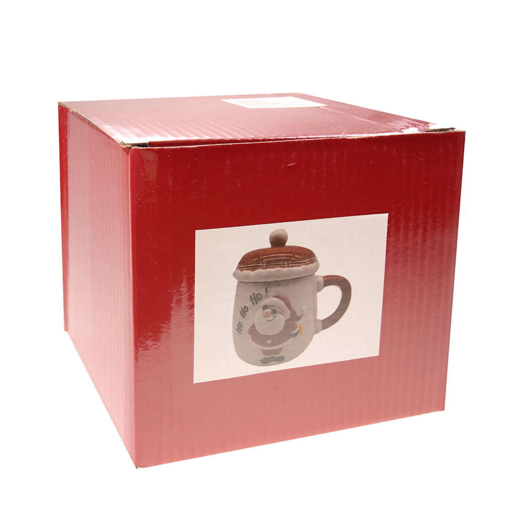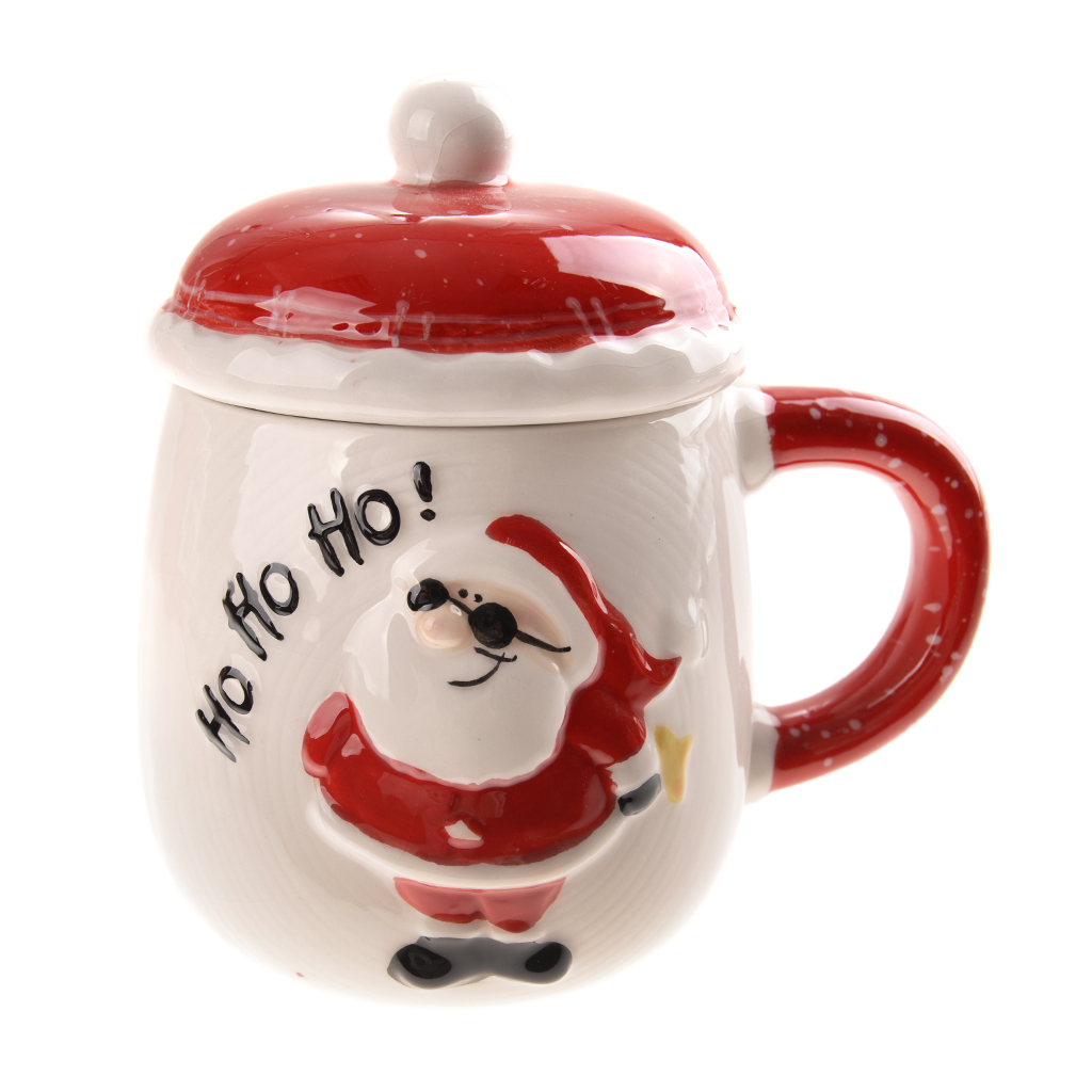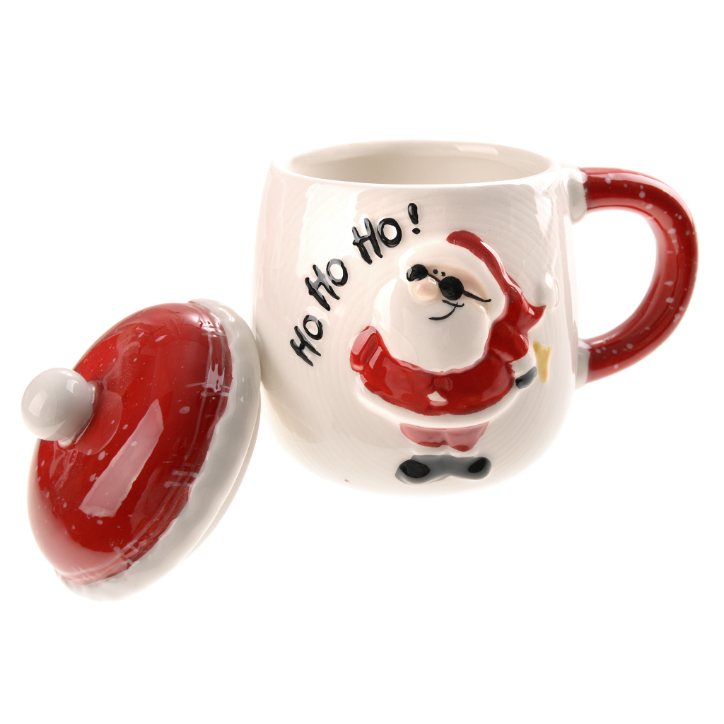 Керамична тумбеста чаша с капаче. Декорирана е с релефен принт на Дядо Коледа и надпис Ho-Ho-Ho, а на капачето има 3D топче.