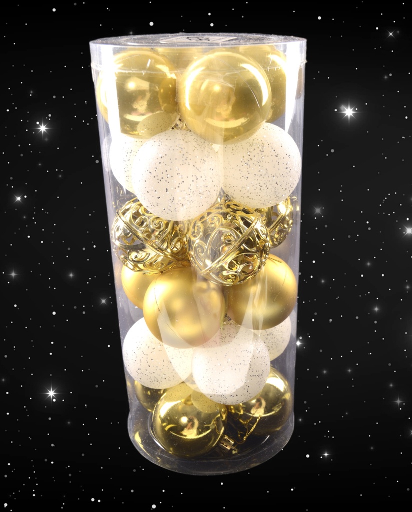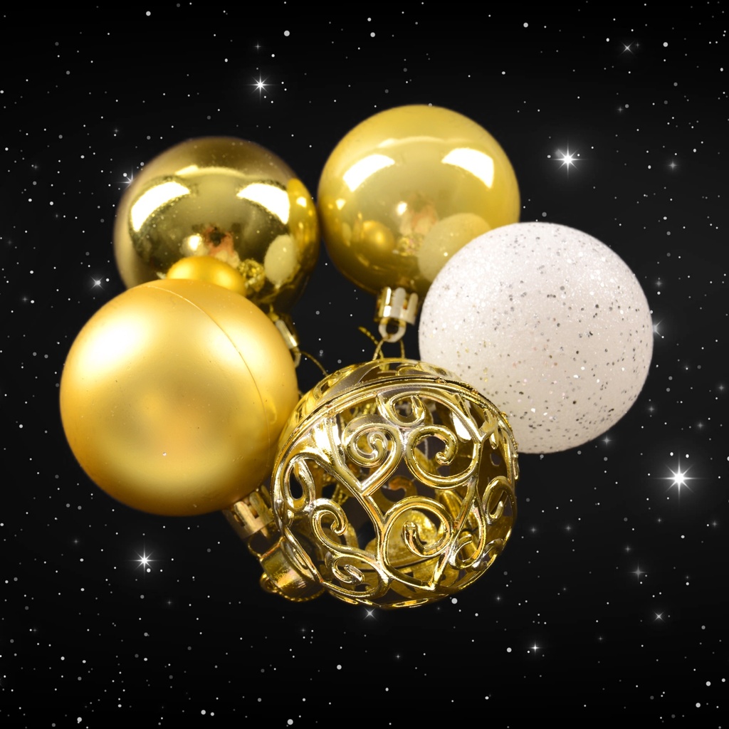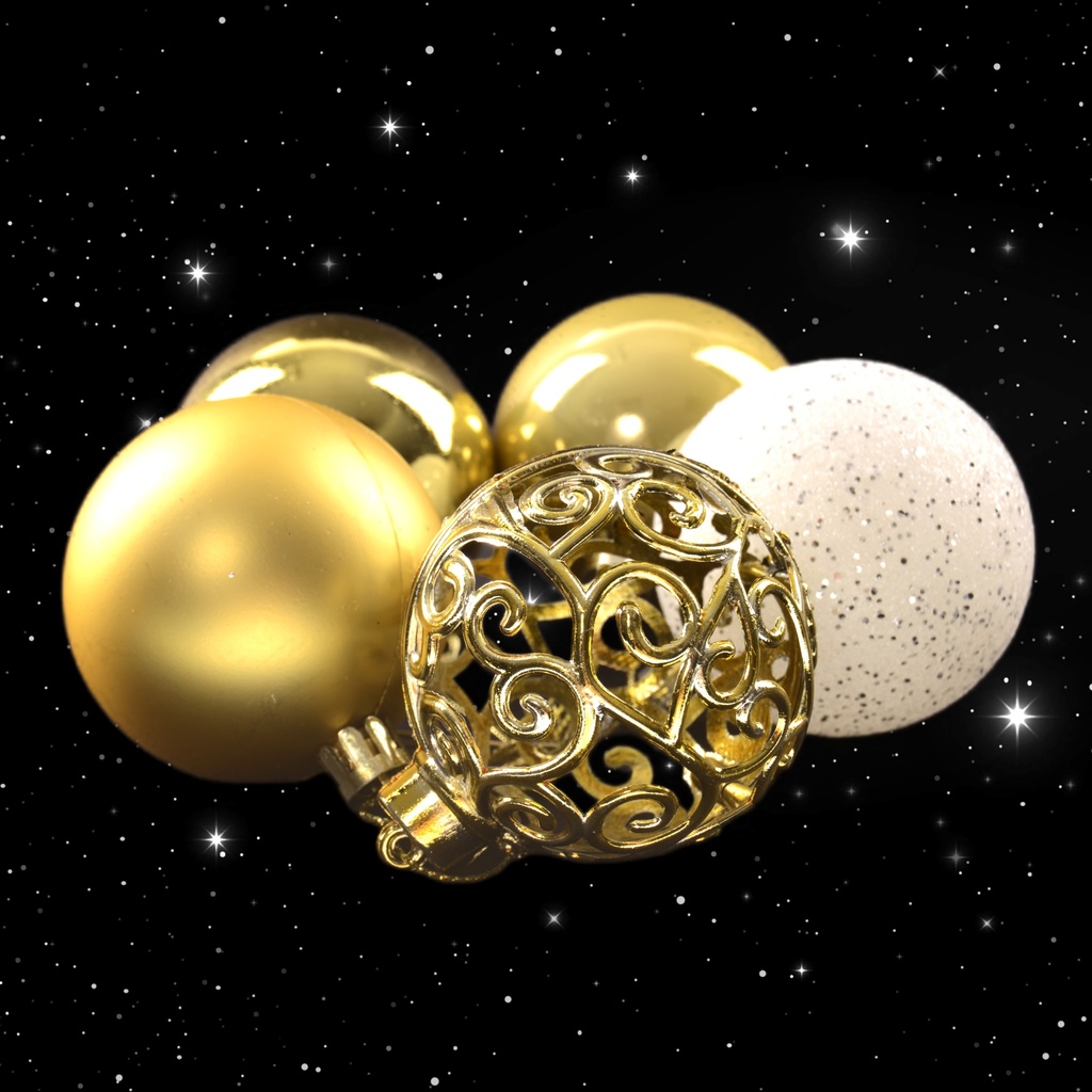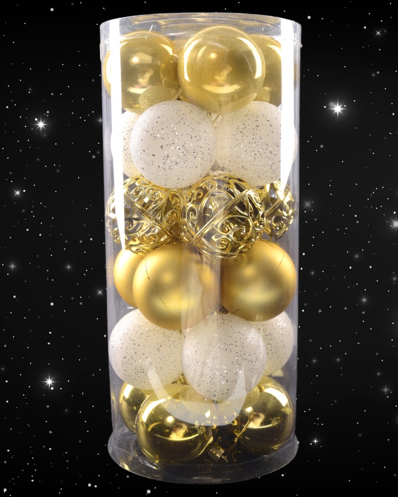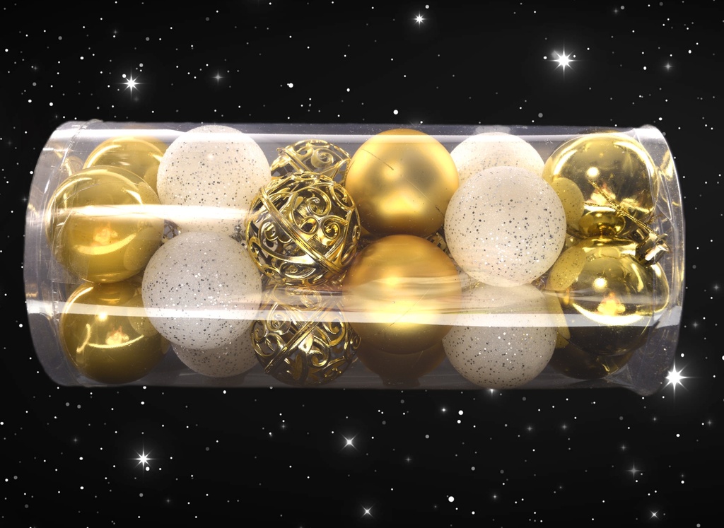 Комплект коледни играчки. Декорирани са в бели и златисти цветове с различни ефекти.