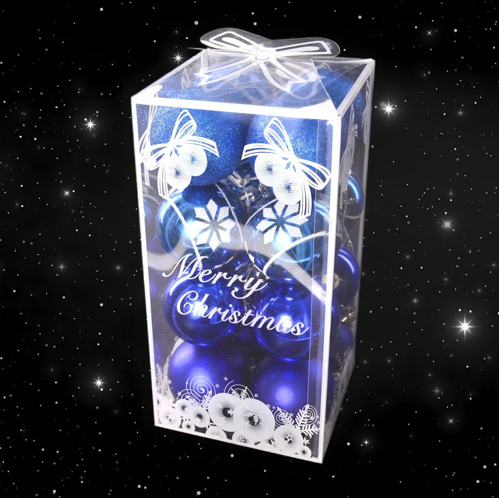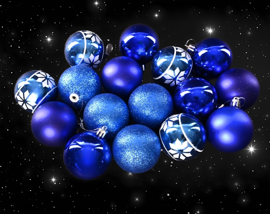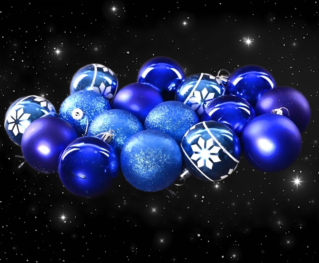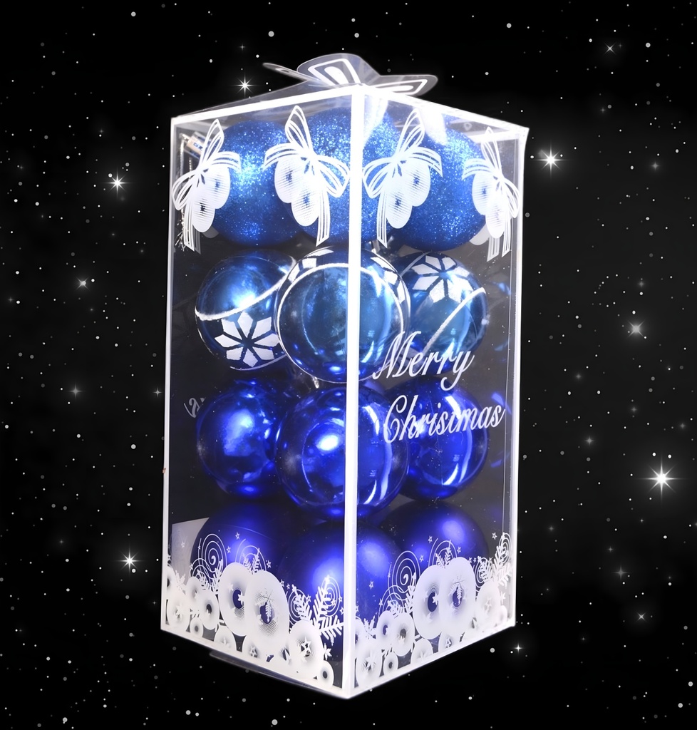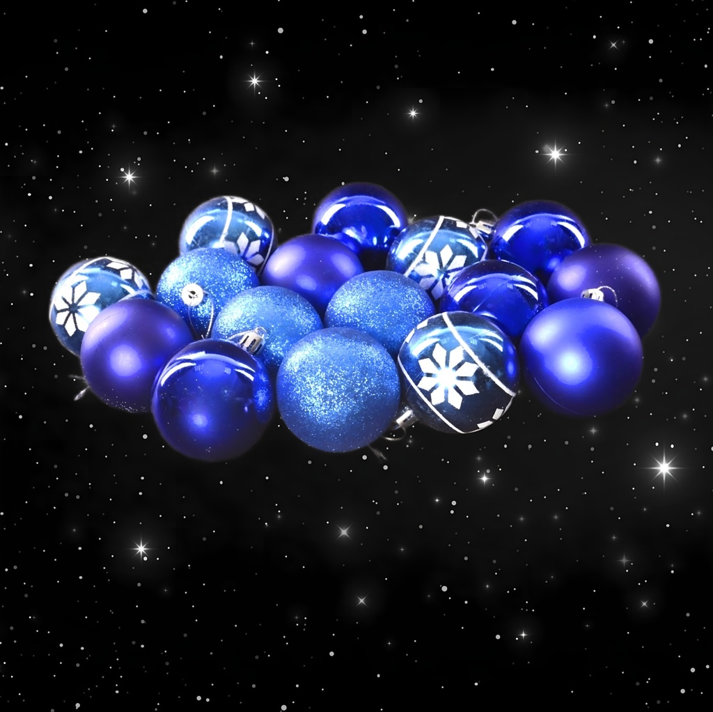 Комплект от 16 броя коледни играчки. Декорирани са в син цвят с различни ефекти.