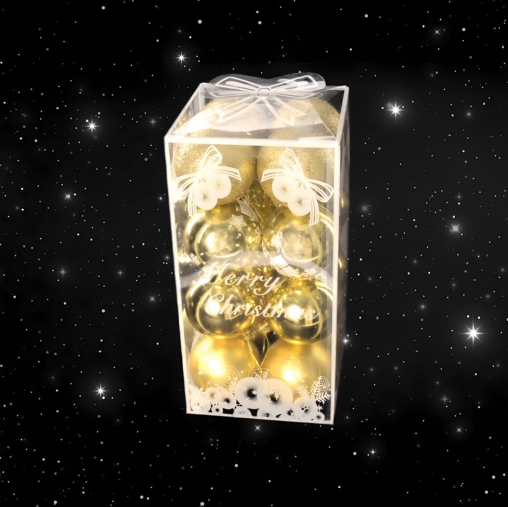 Комплект от 16 броя коледни играчки. Декорирани са в златист цвят с различни ефекти.