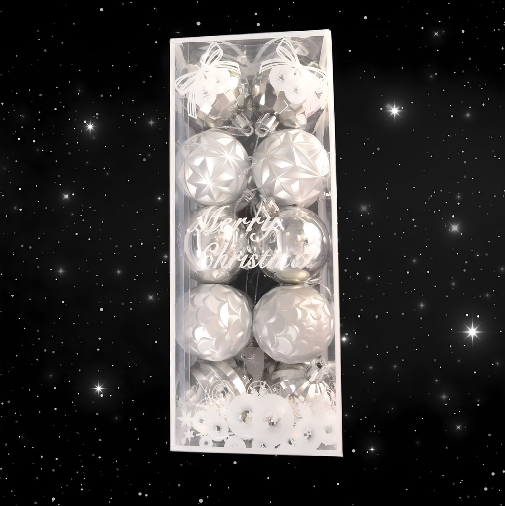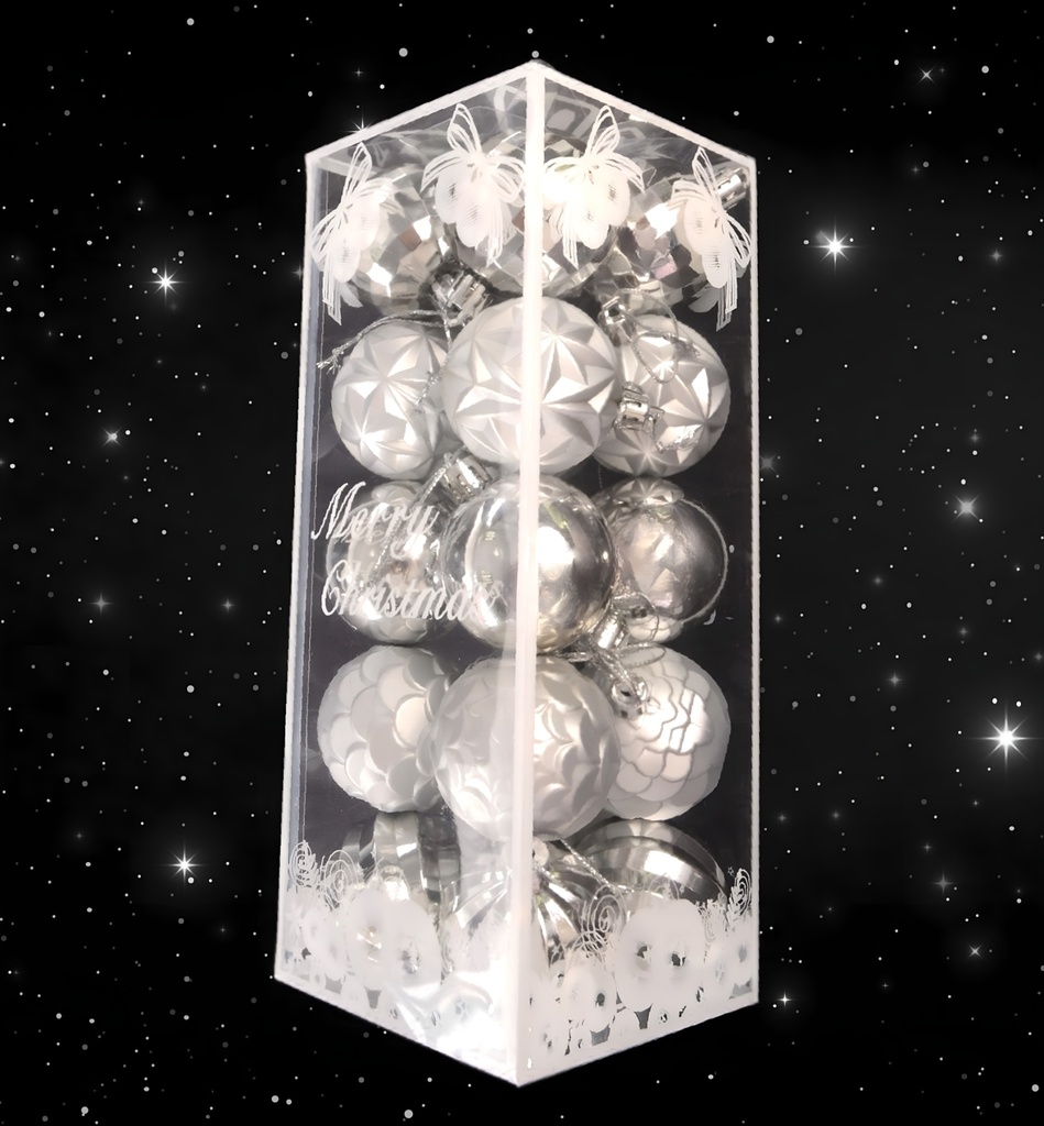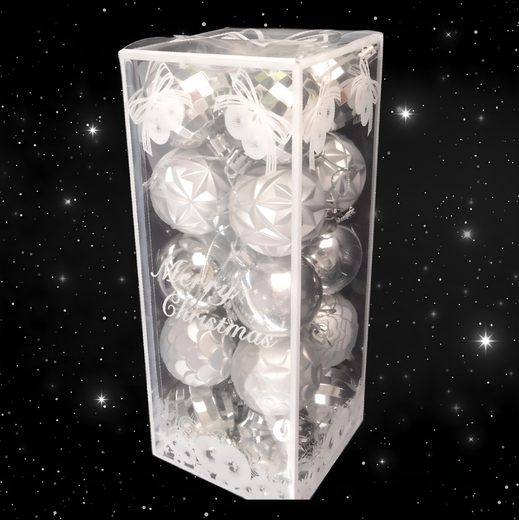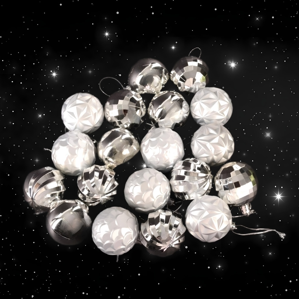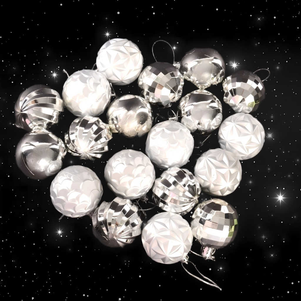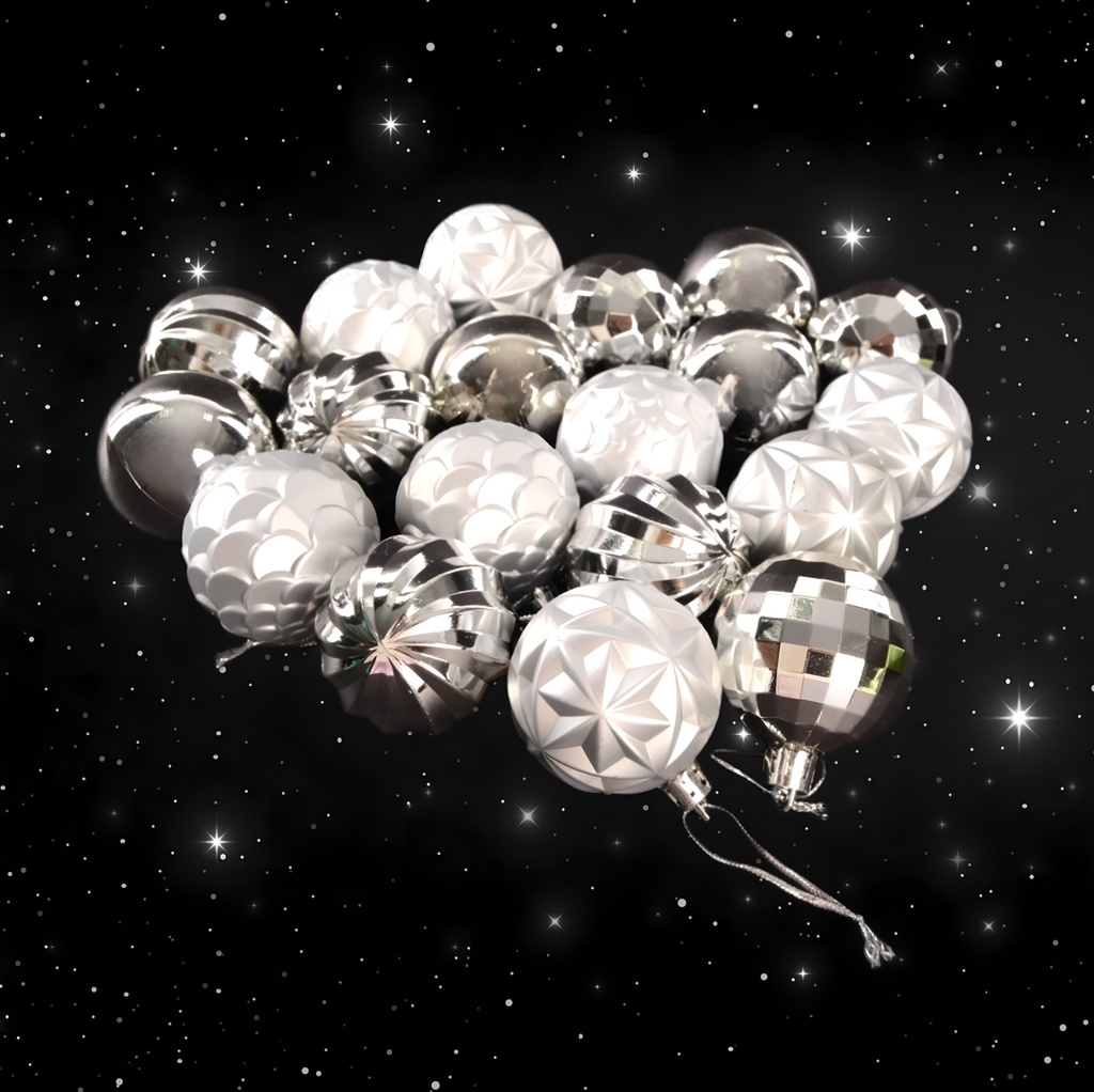 Комплект от 20 броя коледни играчки. Декорирани са в сребрист цвят с различни ефекти.
