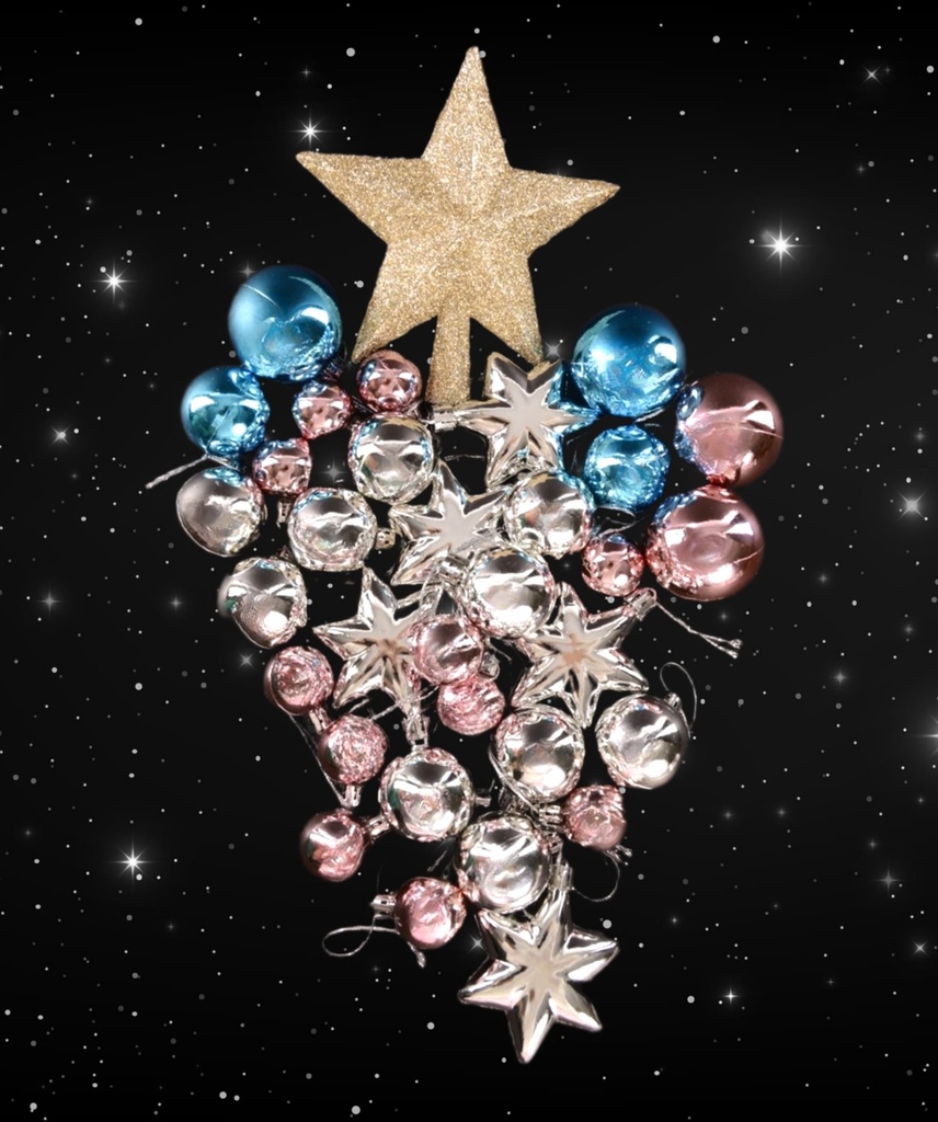 Комплект от 33 броя коледни играчки. Декорирани са в сребристи, сини и розово злато цветове с лъскав ефект.