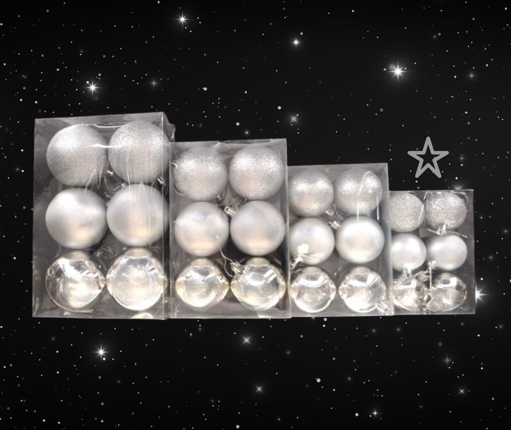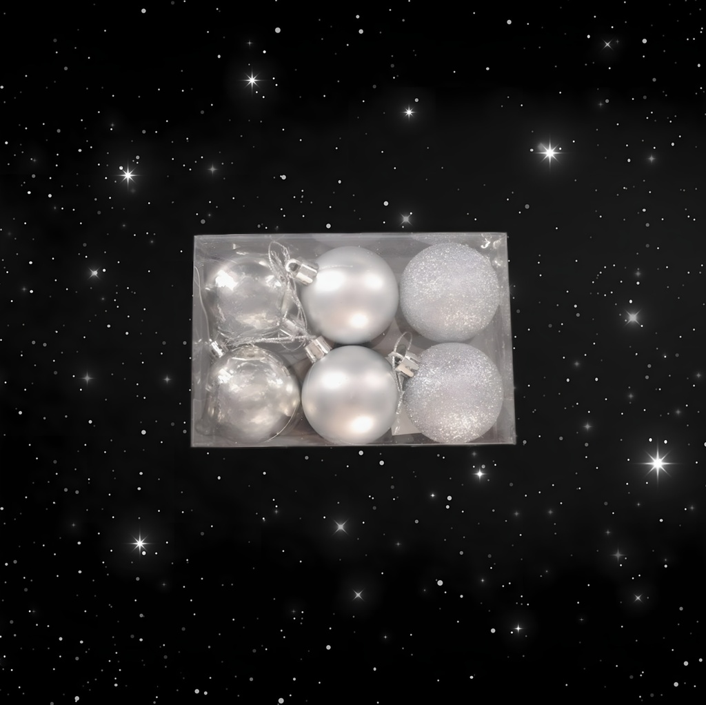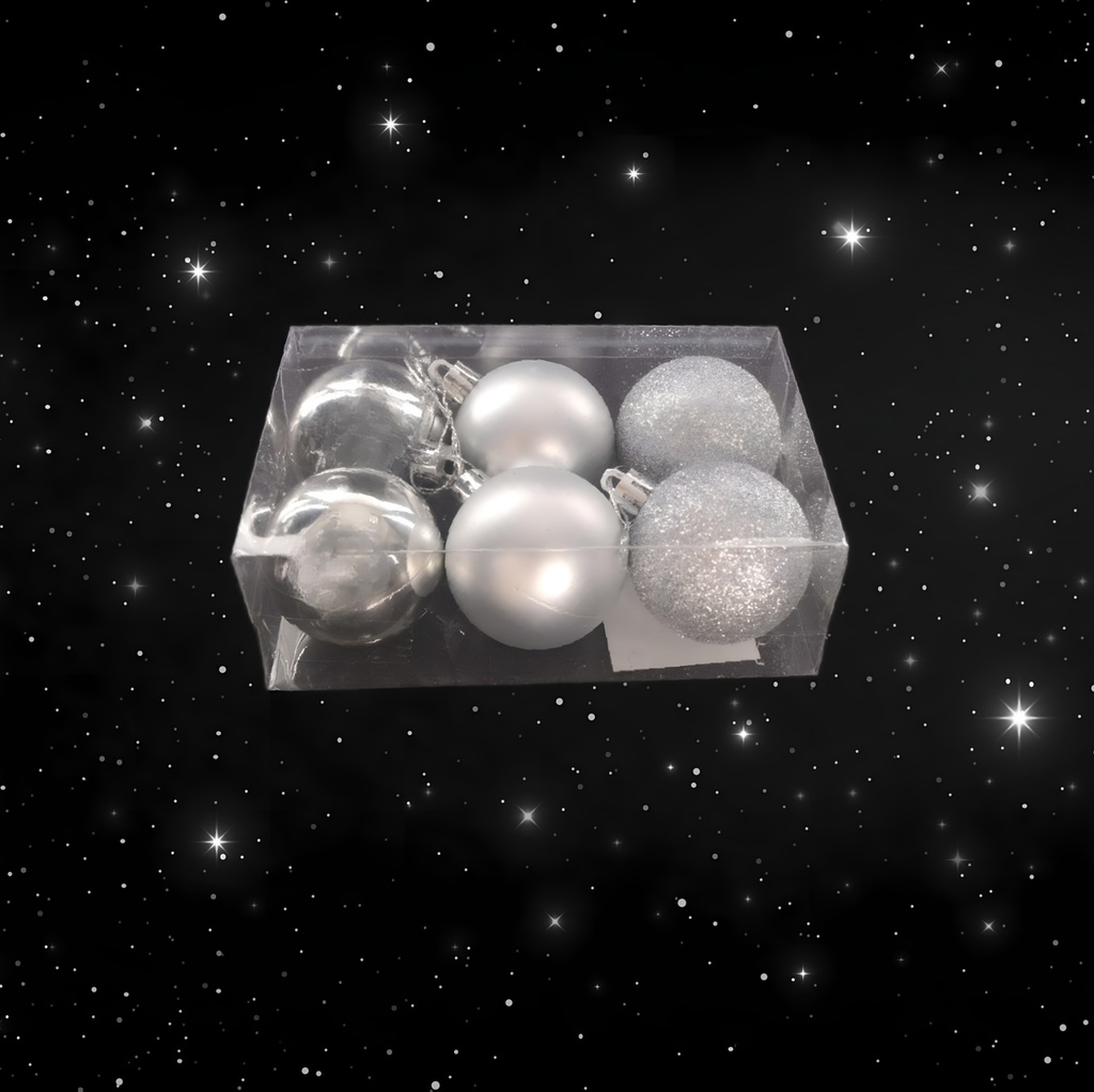 Комплект от 6 броя коледни играчки. Декорирани са в сребрист цвят с различни ефекти.