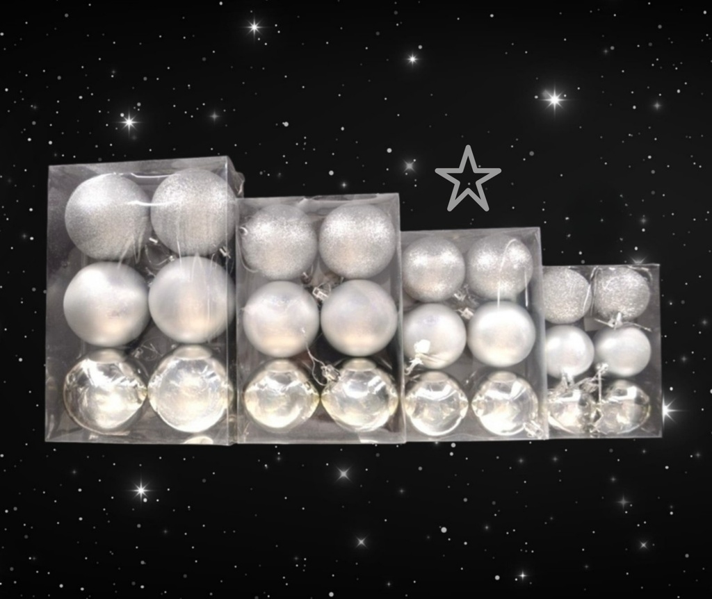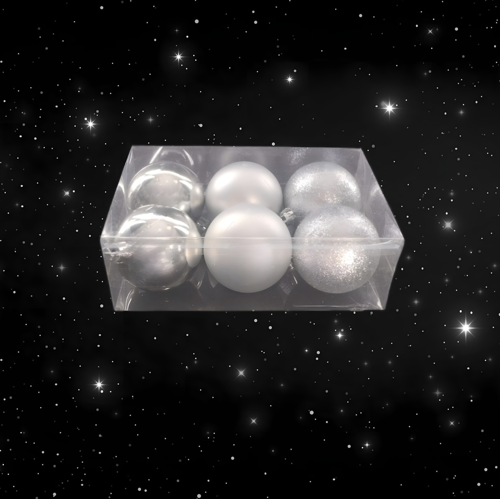 Комплект от 6 броя коледни играчки. Декорирани са в сребрист цвят с различни ефекти.