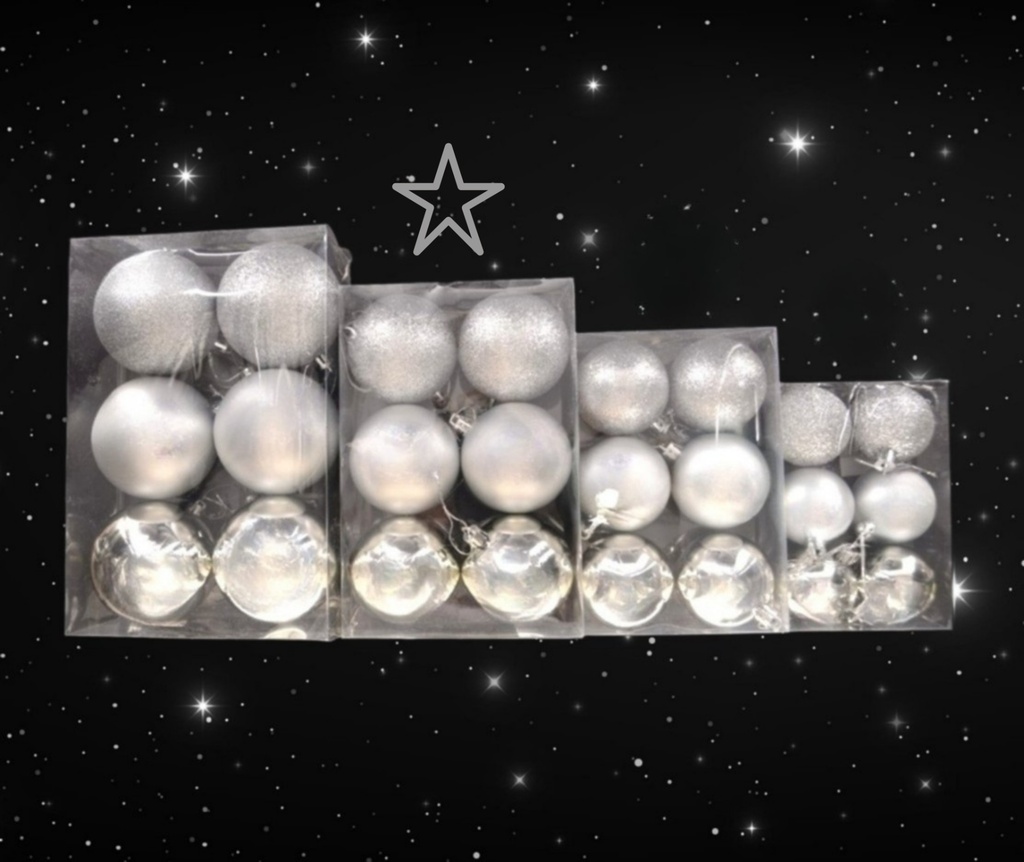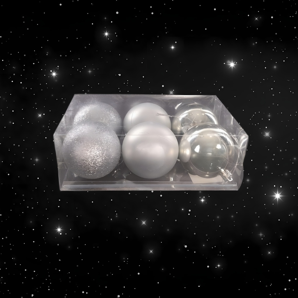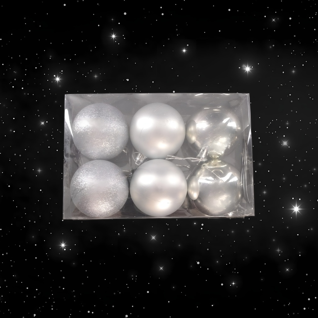 Комплект от 6 броя коледни играчки. Декорирани са в сребрист цвят с различни ефекти.