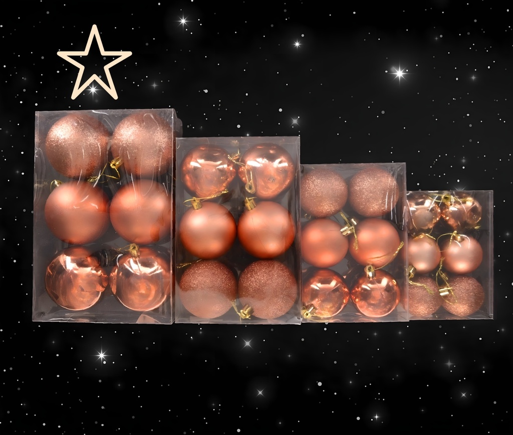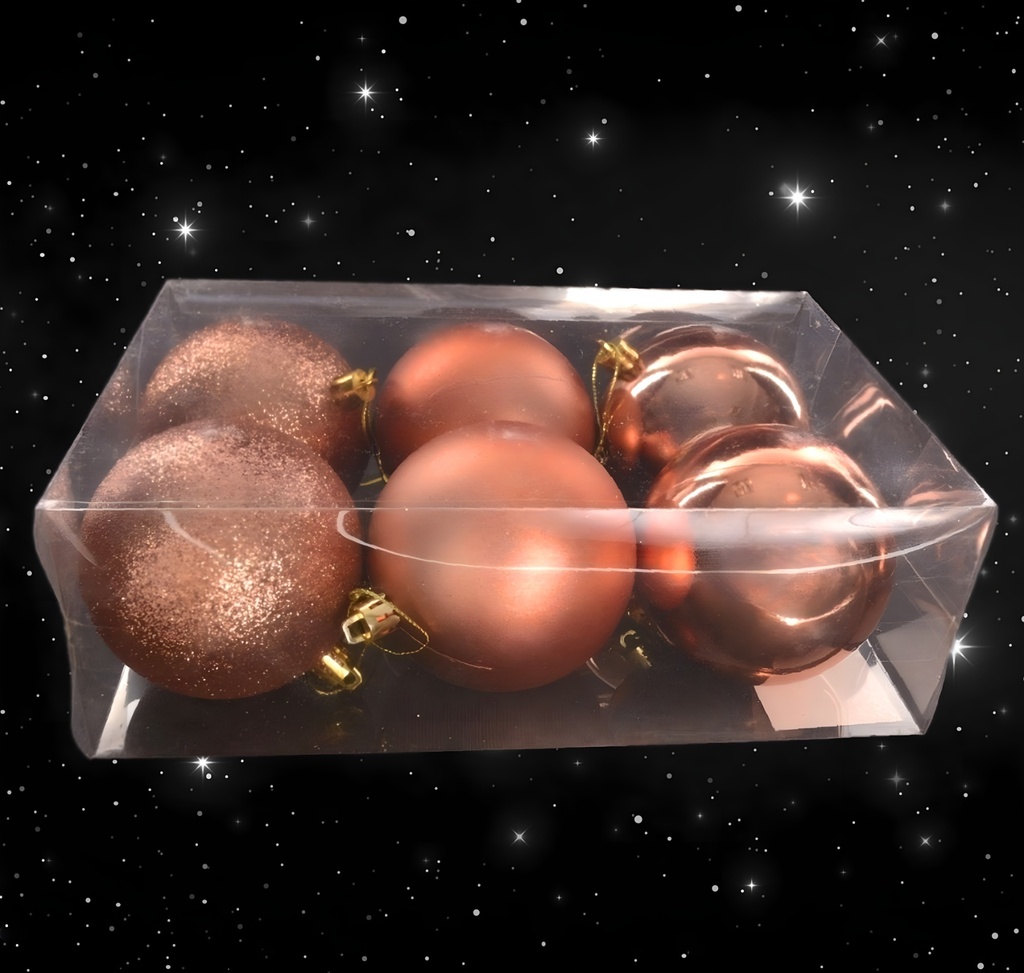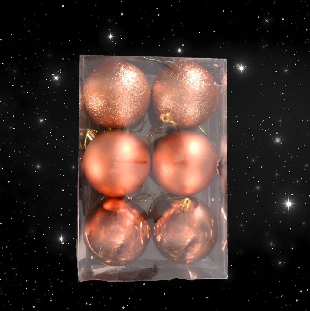 Комплект от 6 броя коледни играчки. Декорирани са в цвят розово злато с различни ефекти.