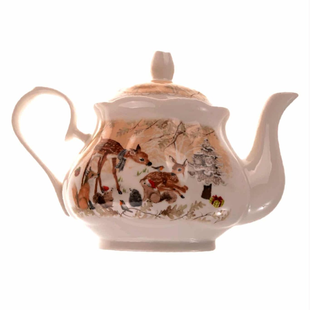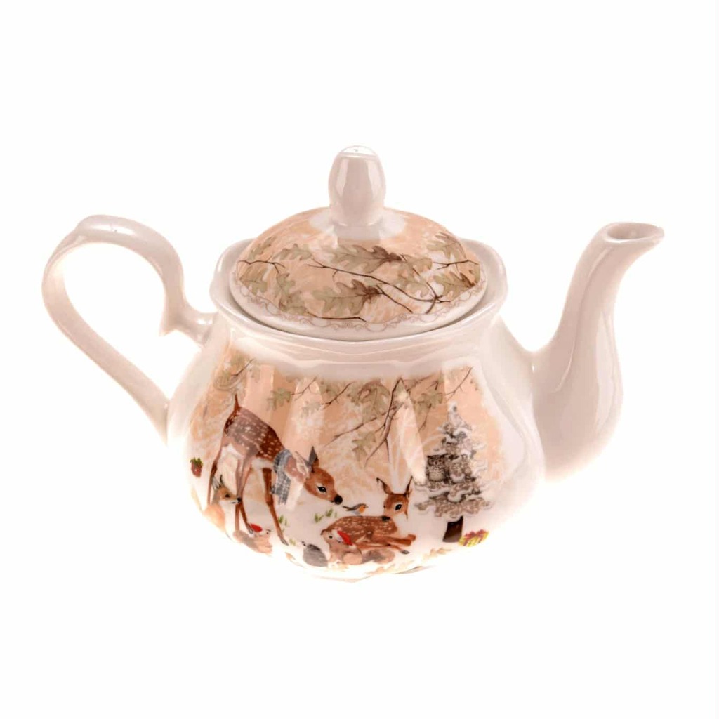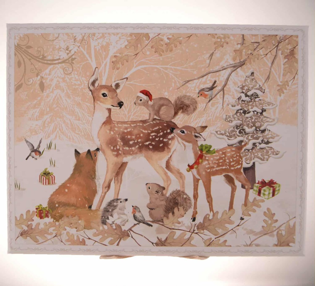 Декориран е с принт на сърни и други животни на фона на заснежена гора.