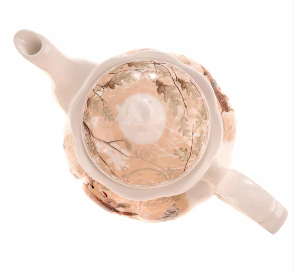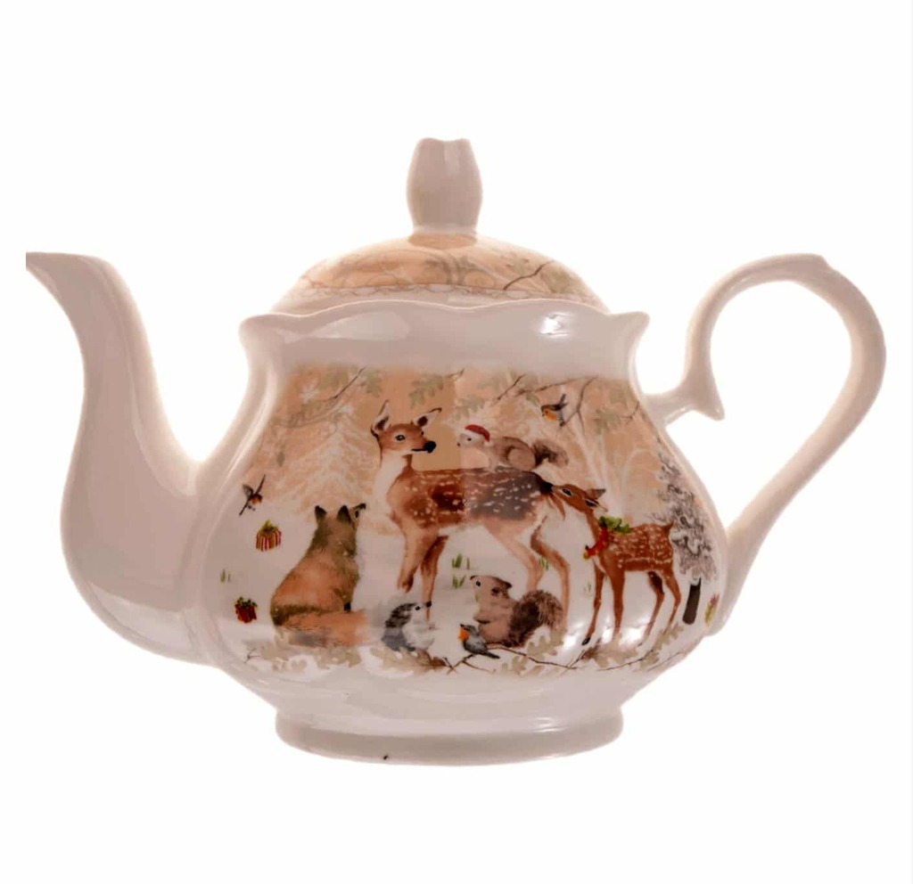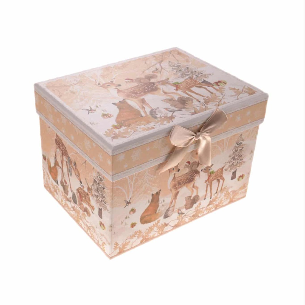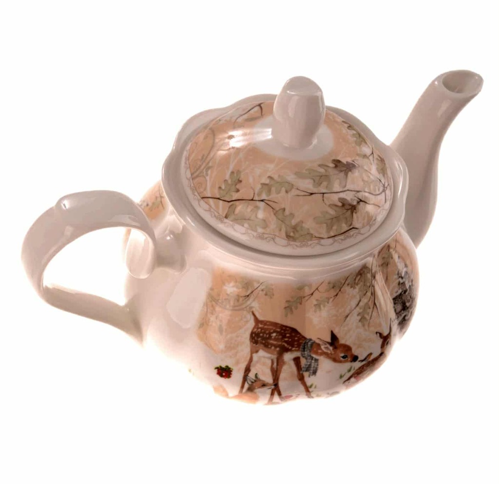 Декориран е с принт на сърни и други животни на фона на заснежена гора.