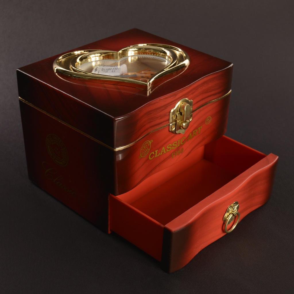 Музикална кутия за бижута с огледало и отделения за пръстени, обеци и колиета.