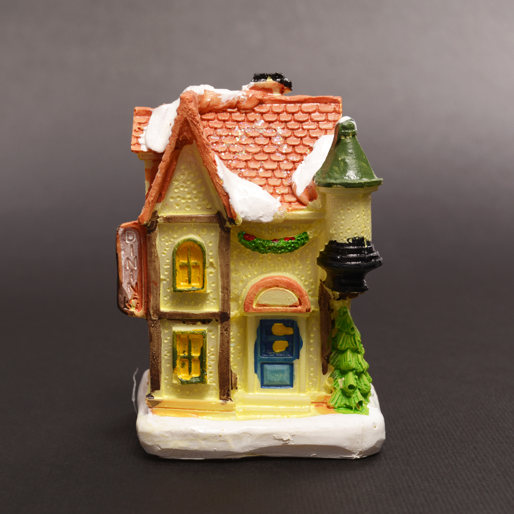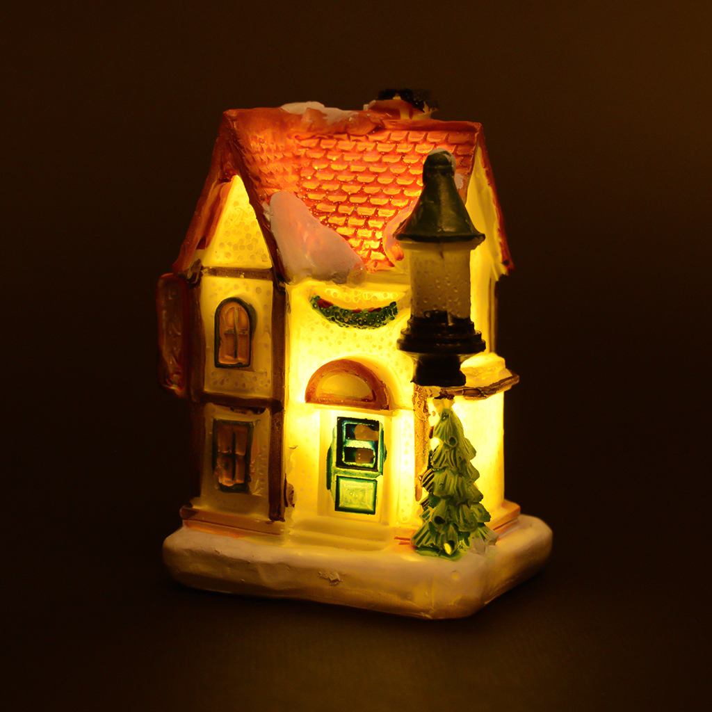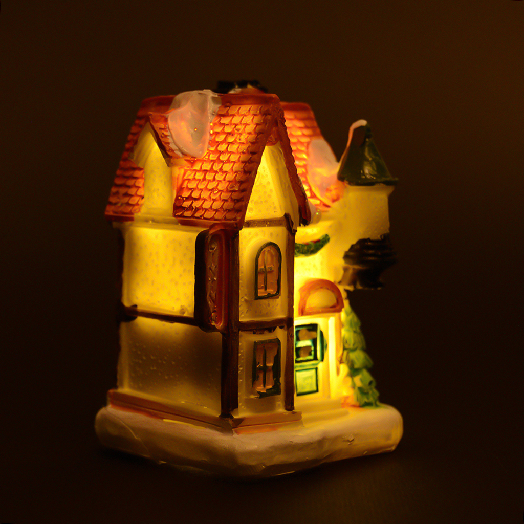 Сувенирна декоративна коледна фигурка - светеща къщичка. Украсена е с празнични декори и сняг.